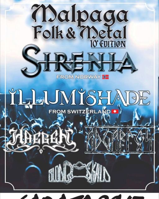 La prima di due serate stratosferiche: per festeggiare il decimo anno del Malpaga Folk & Metal Fest avremo 5 band: i Sirena dalla Norvegia, gli Illumishade dalla Svizzera, gli italiani Blodiga Skald, Haegen e Adgarios.