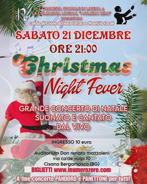 Sabato 21 dicembre alle ore 21, l'Orchestra Stoppani in Musica e la Compagnia Musical Numero Zero organizzano un evento imperdibile: Christmas Night Fever, un grande concerto di Natale suonato e cantato dal vivo. Questo spettacolo natalizio si terrà presso l'Auditorium Don Renato Mazzoleni e sarà un'opportunità unica per vivere la magia del Natale attraverso la musica.
