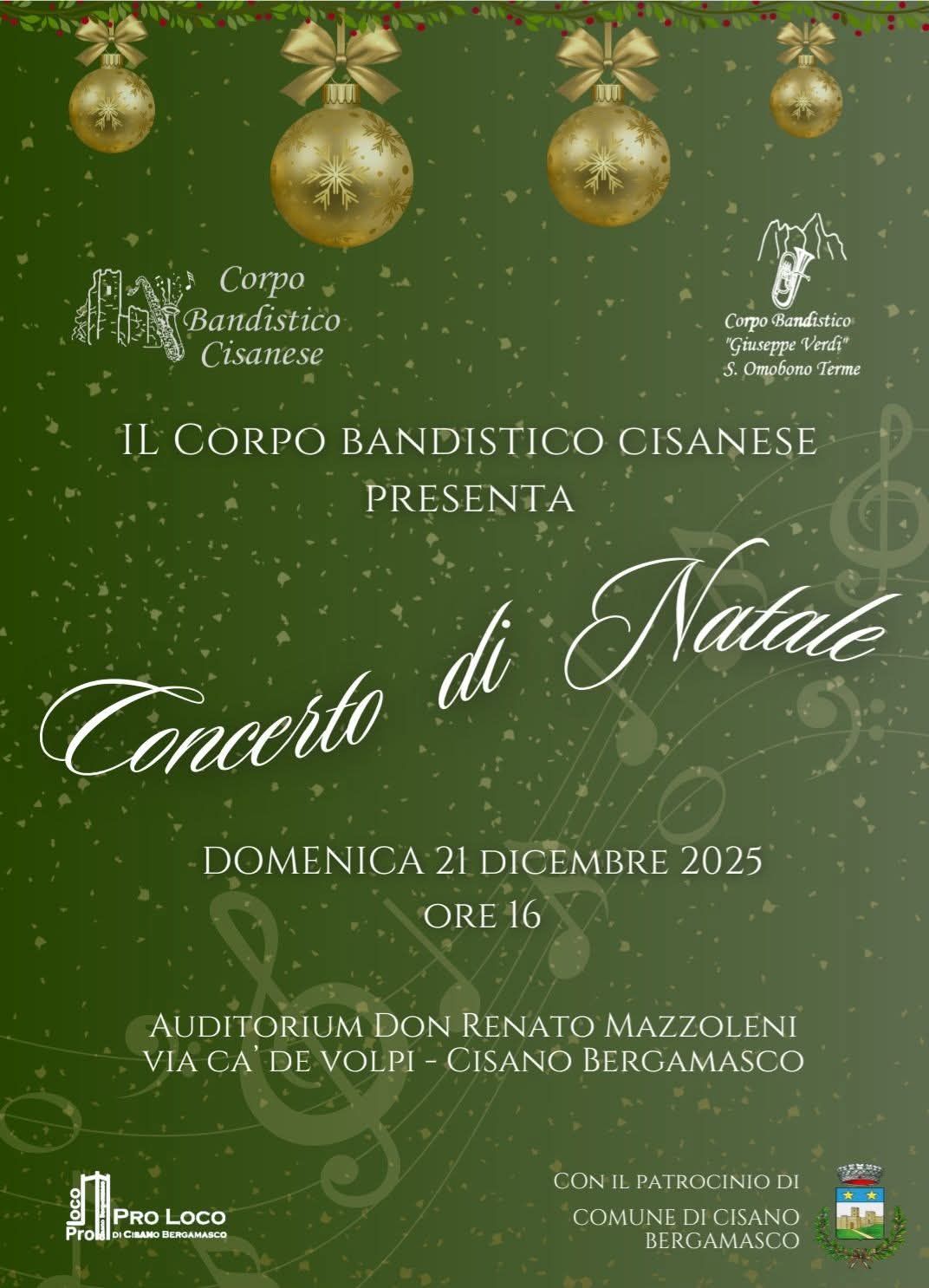Domenica 21 dicembre , atmosfera festiva a Cisano Bergamasco. Alle 16 l'Auditorium Don Renato Mazzoleni in Via Ca' de Volpi ospiterà il tradizionale Concerto di Natale.