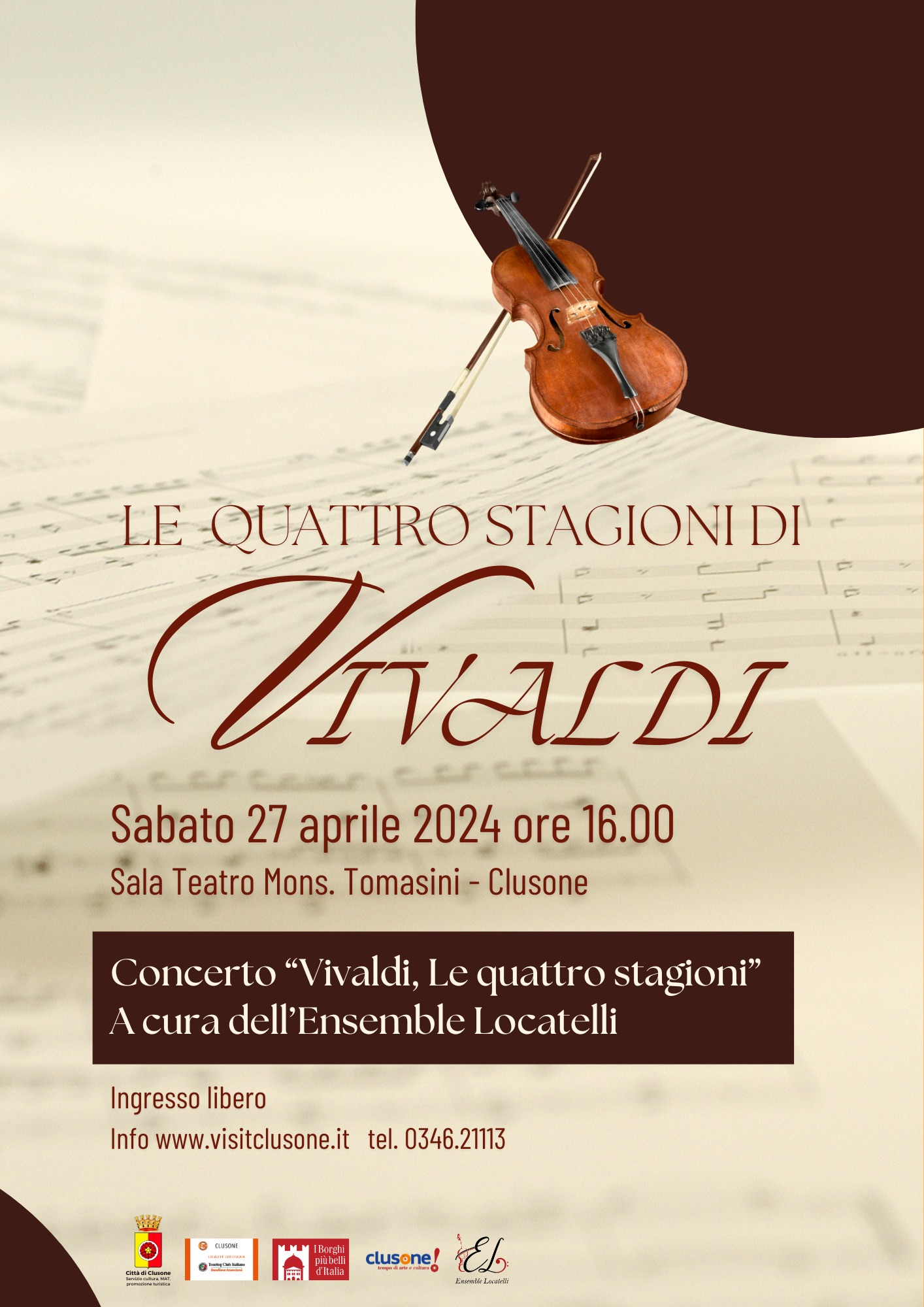 Presso il Teatro Monsignor Tomasini di Clusone, si terrà il concerto "Vivaldi, le quattro stagioni" a cura dell'Ensemble Locatelli.