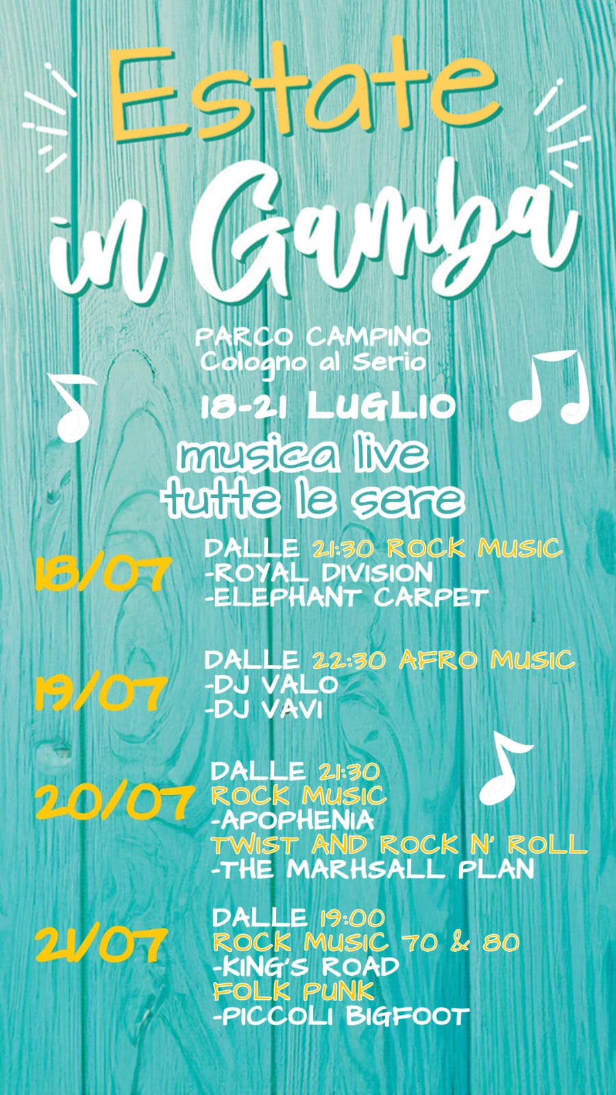 Estate in Gamba dal 18 al 21 Luglio , evento con musica live organizzato da Progetto Gamba Onlus, il ricavato verrà donato per i progetti in essere in Bolivia e Ruanda.