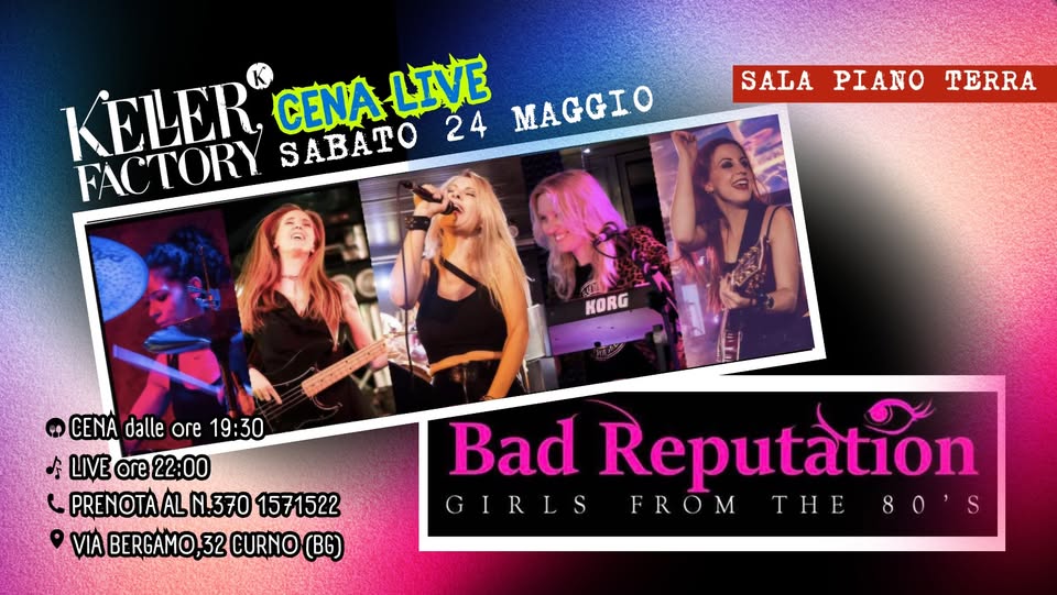 Preparatevi per una serata esplosiva e carica di adrenalina! Il Keller Factory ospita le Bad Reputation: una rock band tutta al femminile pronta a farvi rivivere le sonoritร che hanno fatto la storia degli anni '80. Sarร un viaggio musicale tra riff leggendari, ritmi trascinanti e unโenergia inarrestabile che vi farร saltare dalle sedie!