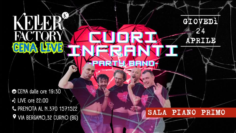 Speciale Festa della Donna al Keller Factory con i Cuori Infranti! Il 7 marzo si trasforma in una festa indimenticabile! I Cuori Infranti sono pronti a regalarvi una serata piena di energia, risate e tanta musica. Una performance unica che unisce cabaret, musica dal vivo e tanto divertimento per celebrare al meglio la Festa della Donna!