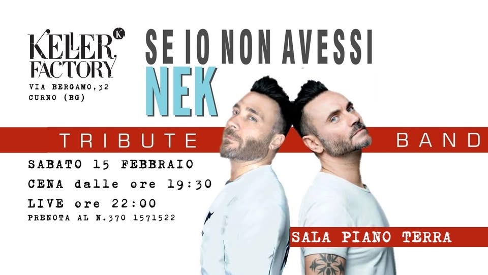 Lasciatevi trasportare dalle emozioni e dalle note indimenticabili della musica, tributo al celebre cantautore italiano Nek. Una serata magica che vi farà cantare e ballare a squarciagola!