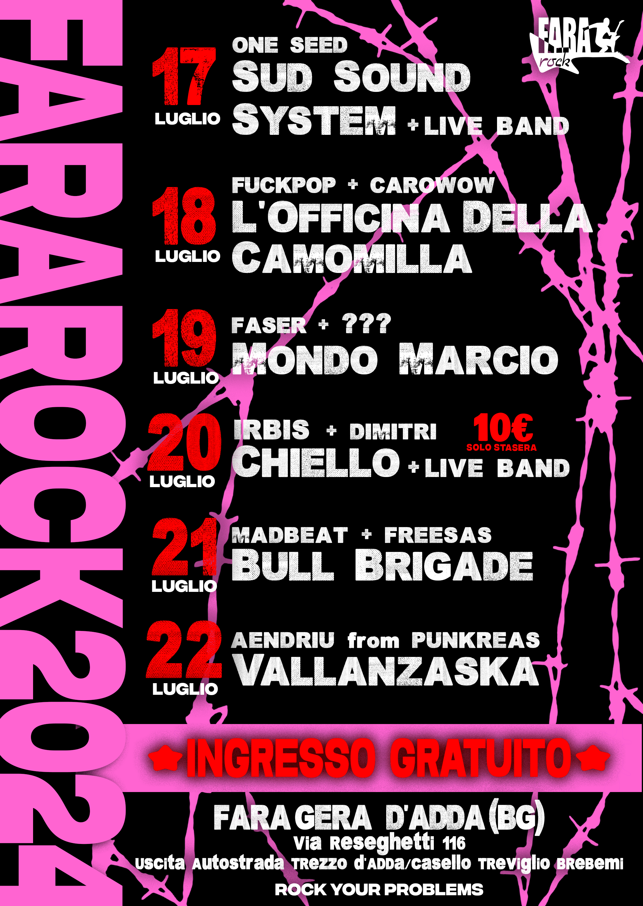 Ormai ci siamo! Il rock è pronto a conquistare le rive del fiume Adda con il “Fara Rock”, l’attesissimo appuntamento di Fara Gera d’Adda che dal 17 al 22 porterà tanti nomi e artisti della scena nazionale. Il calendario di concerti si aprirà il mercoledì 17 con i Sud Sound System e proseguirà nei giorni successivi con L’Officina della Camomilla (18 luglio), Mondo Marcio (19 luglio), Chiello (20 luglio), Bull Brigade (21 luglio) e Vallanzaska (22 luglio).