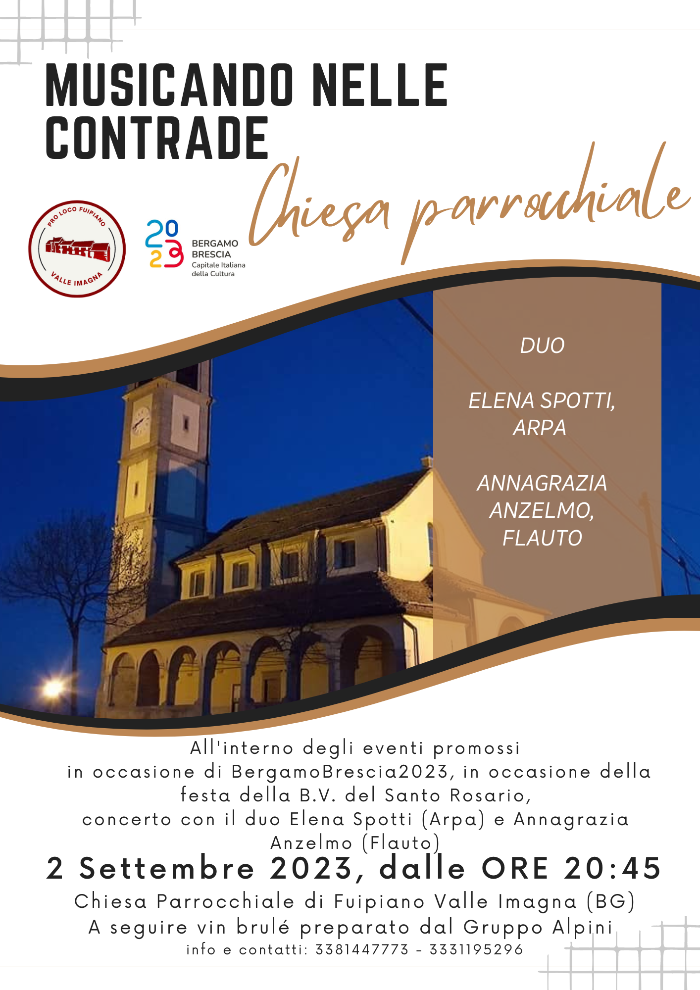 All'interno della serie di eventi "Bergamo Brescia 2023 events", la Proloco di Fuipiano propone uno spettacolo musicale con arpa e flauto.
