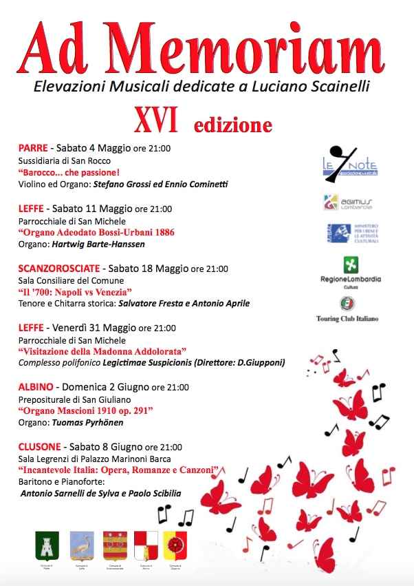 - Sabato 08 giugno a Clusone alle 21 presso la Sala Legrenzi di Palazzo Marinoni Barca "Incantevole Italia: Opera, Romanzi e Canzoni" - Baritono e Pianoforte: Antonio Sarnelli de Sylva e Paolo Scibilia