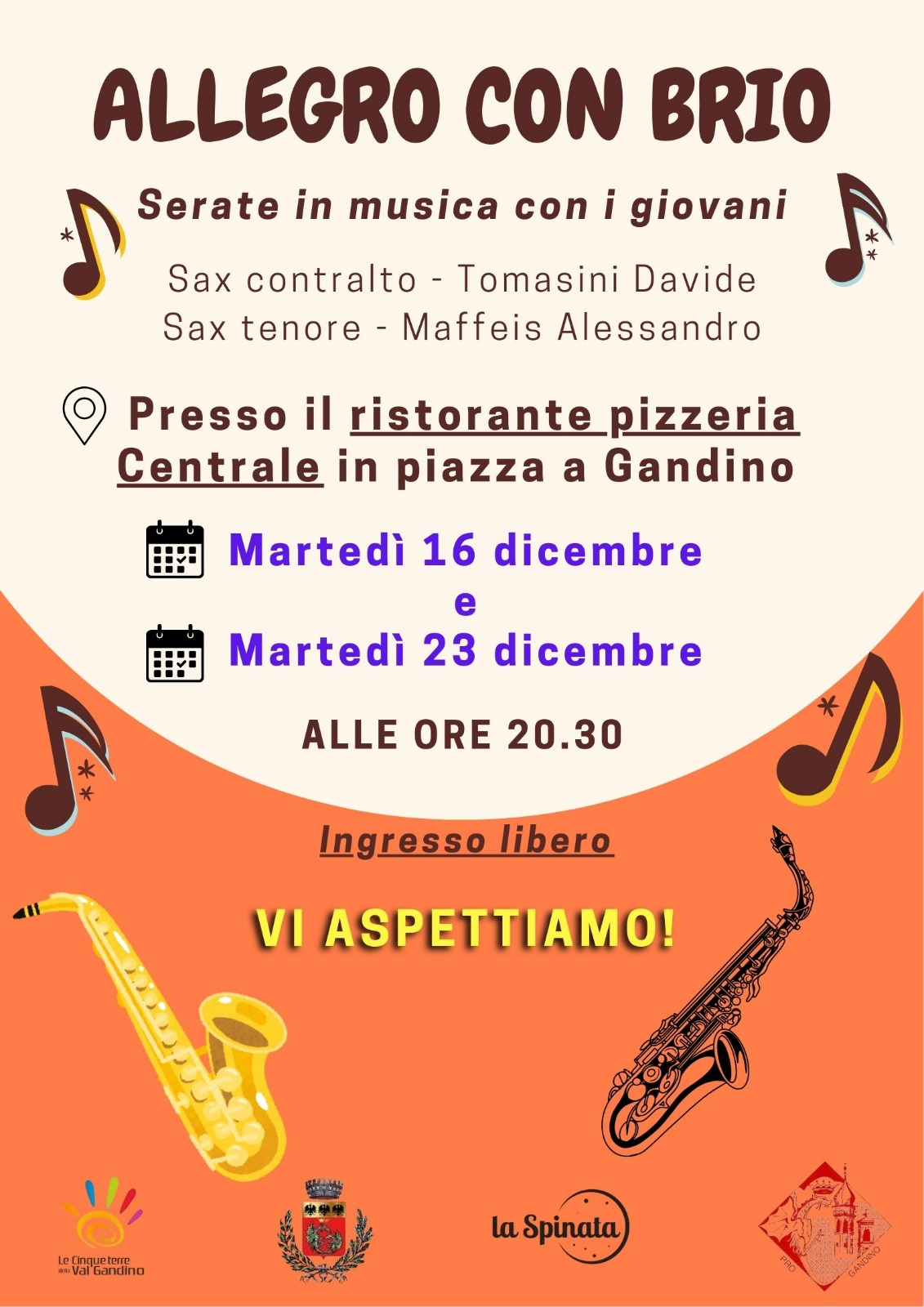 Il ristorante pizzeria Centrale, affacciato sulla piazza di Gandino, ospita due serate dedicate alla musica dal vivo, con protagonisti i giovani musicisti Tomasini Davide al sax contralto e Maffeis Alessandro al sax tenore.