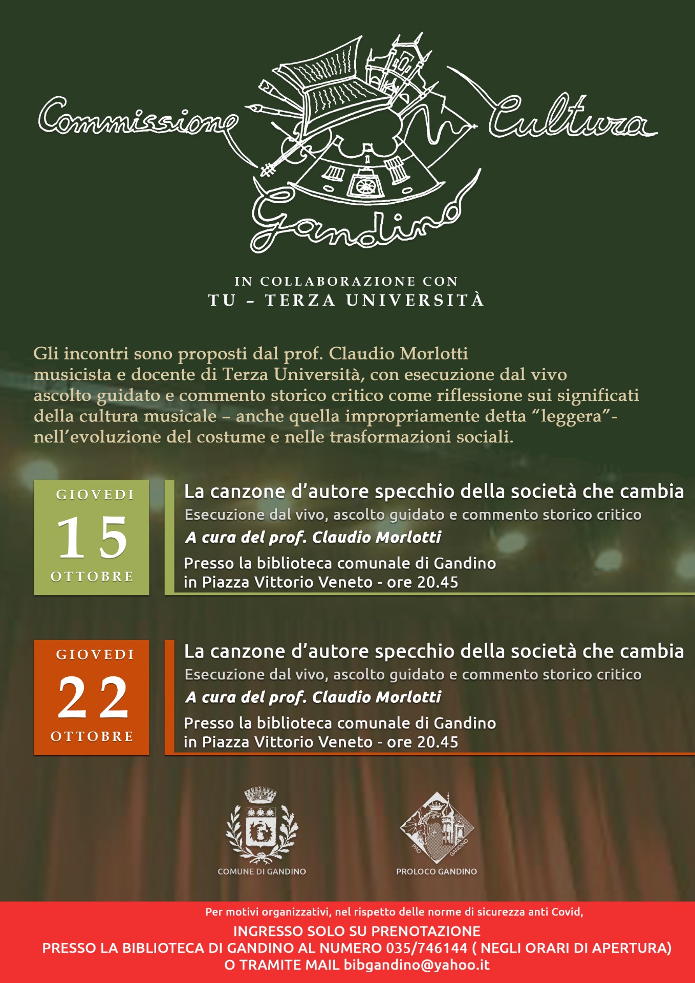 Incontro proposto dal prof. Claudio Morlotti, musicista e docente di Terza Università, con esecuzione dal vivo, ascolto guidato e commento storico critico come riflessione sui significati della cultura musicale - anche quella impropriamente detta "leggera" - nell'evoluzione del costume e nelle trasformazioni sociali.