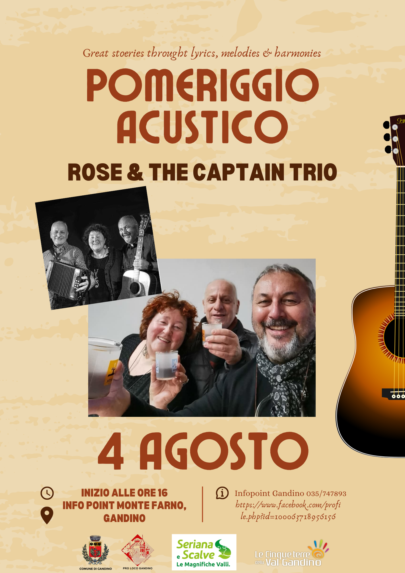 Domenica 4 agosto è in programma il pomeriggio acustico Rose & The Captain Trio.