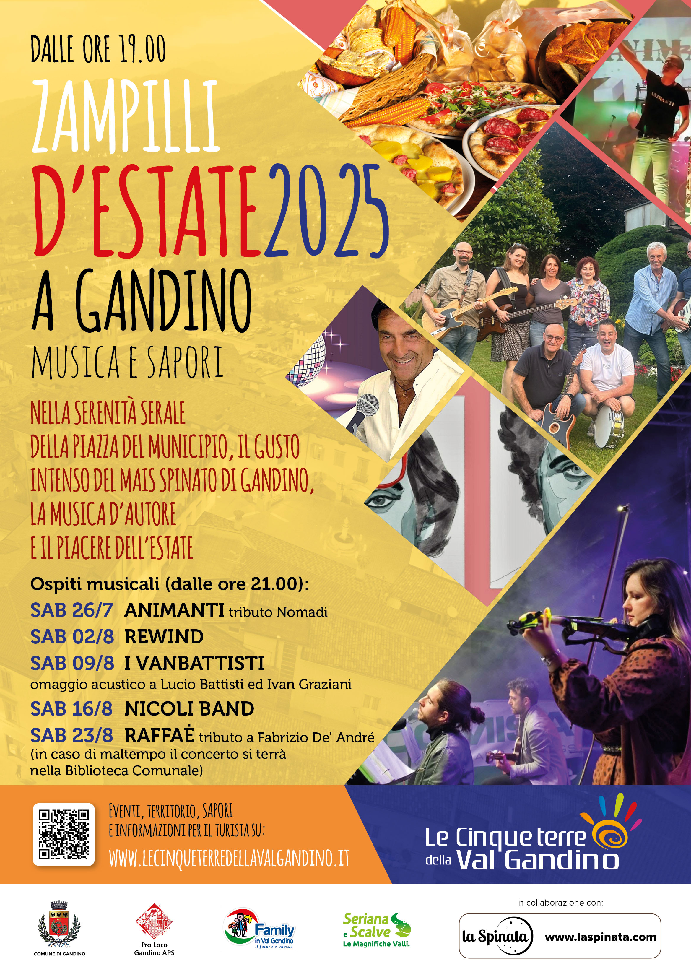 La serata d’esordio di Zampilli d’Estate vedrà protagonista sabato 26 luglio gli Animanti, con il loro tributo ai Nomadi. Sabato 2 agosto imperdibile serate con i brani evergreen dei Rewind, mentre sabato 9 agosto “I Van Battisti” proporranno un omaggio acustico a Lucio Battisti e Ivan Graziani. Sabato 16 agosto ritmo e voglia di ballare grazie a Nicoli Band e sabato 23 agosto serata conclusiva con “Raffaé – tributo a Fabrizio De André”. In caso di maltempo quest’ultimo concerto verrà proposto nell’Auditorium della Biblioteca Comunale. Programma completo su www.lecinqueterredellavalgandino.it