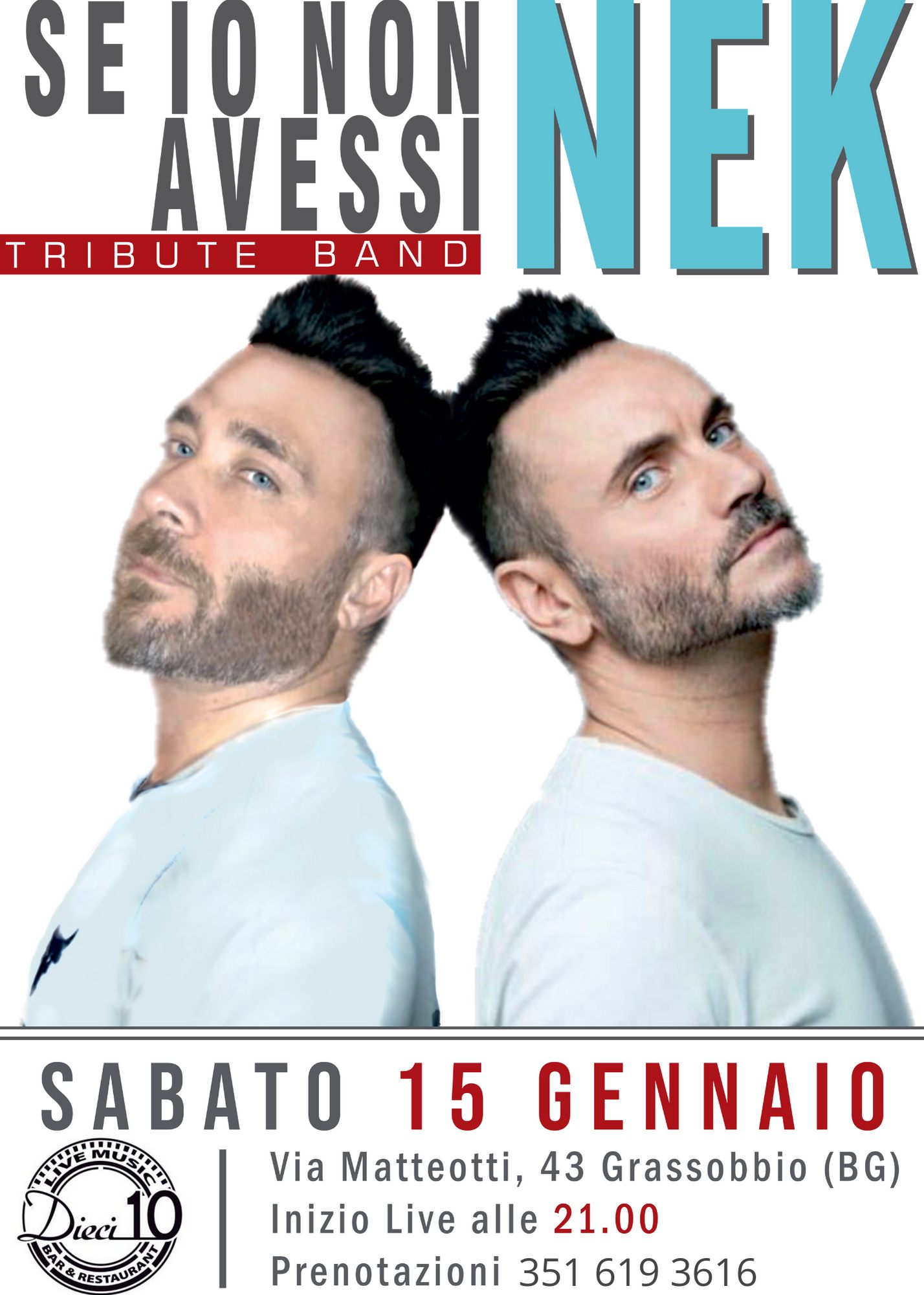 Al Dieci10 di Grassobbio continuano le serate all'insegna della musica live, sabato sera suona una Tribute band di Nek.