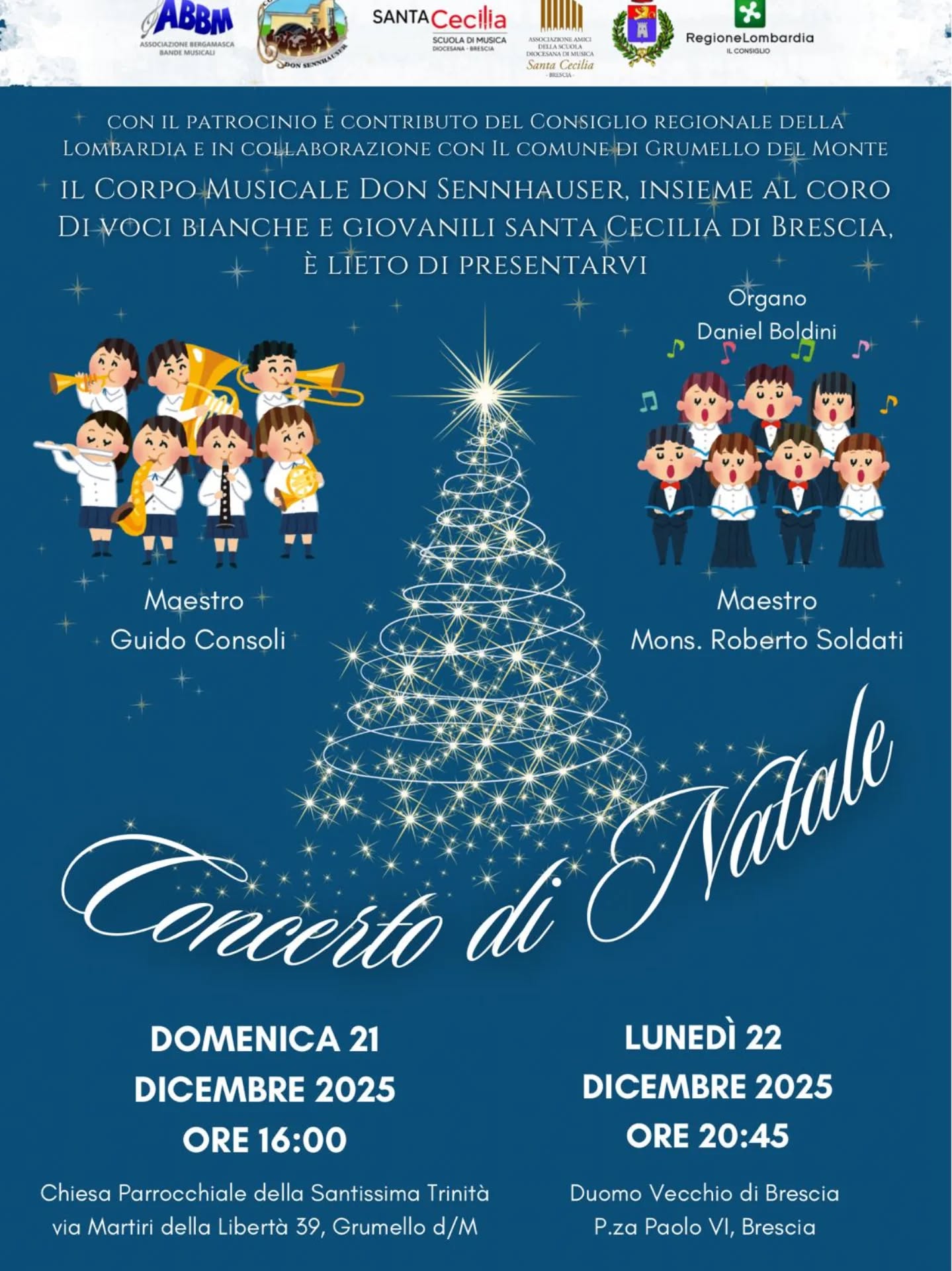 Alle 16, presso la Chiesa Parrocchiale della Santissima Trinità, il Corpo Musicale Don Sennhauser, diretto dal Maestro Guido Consoli, si unirà al Coro di voci bianche e giovanili Santa Cecilia di Brescia, sotto la direzione del Maestro Mons. Roberto Soldati, per offrire al pubblico un repertorio natalizio ricco di emozione e intensità. All’organo accompagnerà il concerto Daniel Boldini, contribuendo a creare un’atmosfera ancora più raccolta e solenne.