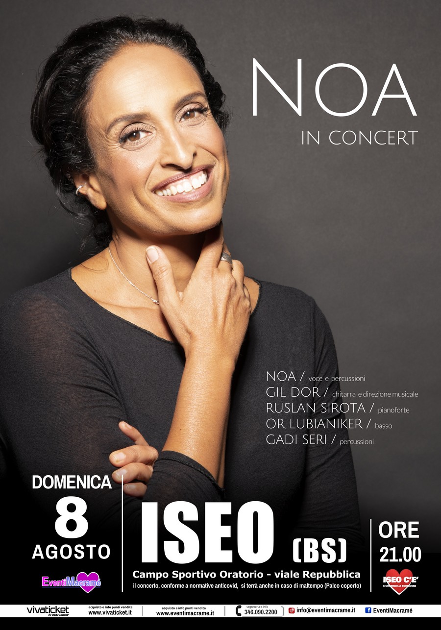 NOA, la magnetica cantante israeliano yemenita con cittadinanza italiana, torna ad Iseo a distanza di 4 anni dal meraviglioso concerto per la pace del Parco della Rimembranza. Questa volta la formazione sarà addirittura un quintetto, con l'inserimento di un pezzo da novanta, vincitore di un GRAMMY AWARD: il pianista/tastierista ucraino RUSLAN SIROTA, che ha collaborato negli anni con artisti del calibro di Stanley Clarke, Marcus Miller, Al Jarreau, George Duke, Chick Corea , Los Angeles Philarmonic, Larry Carlton, Black Eyed Peas, Josh Groban ecc.. ecc.. ecc...