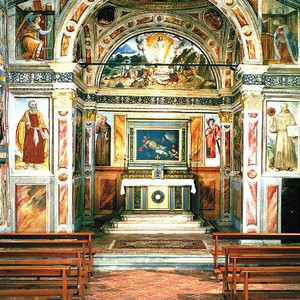 Divenuta Monumento Nazionale per l’importanza storica ed artistica, è considerata un pregevole documento del manierismo lombardo ed una delle rarissime rimaste in lombardia dall’interno completamente affrescato, con cicli dedicati alla vita della Madonna, S. Caterina D’Alessandria, di S. Bernardino e alla Passione, Morte e Resurrezione di Cristo. Nelle due cappelle laterali, aggiunte nel 1532, si trovano affreschi di diversi Santi di grande devozione popolare. Nei sottarchi della navata sono raffigurati le Sibille e i Profeti.