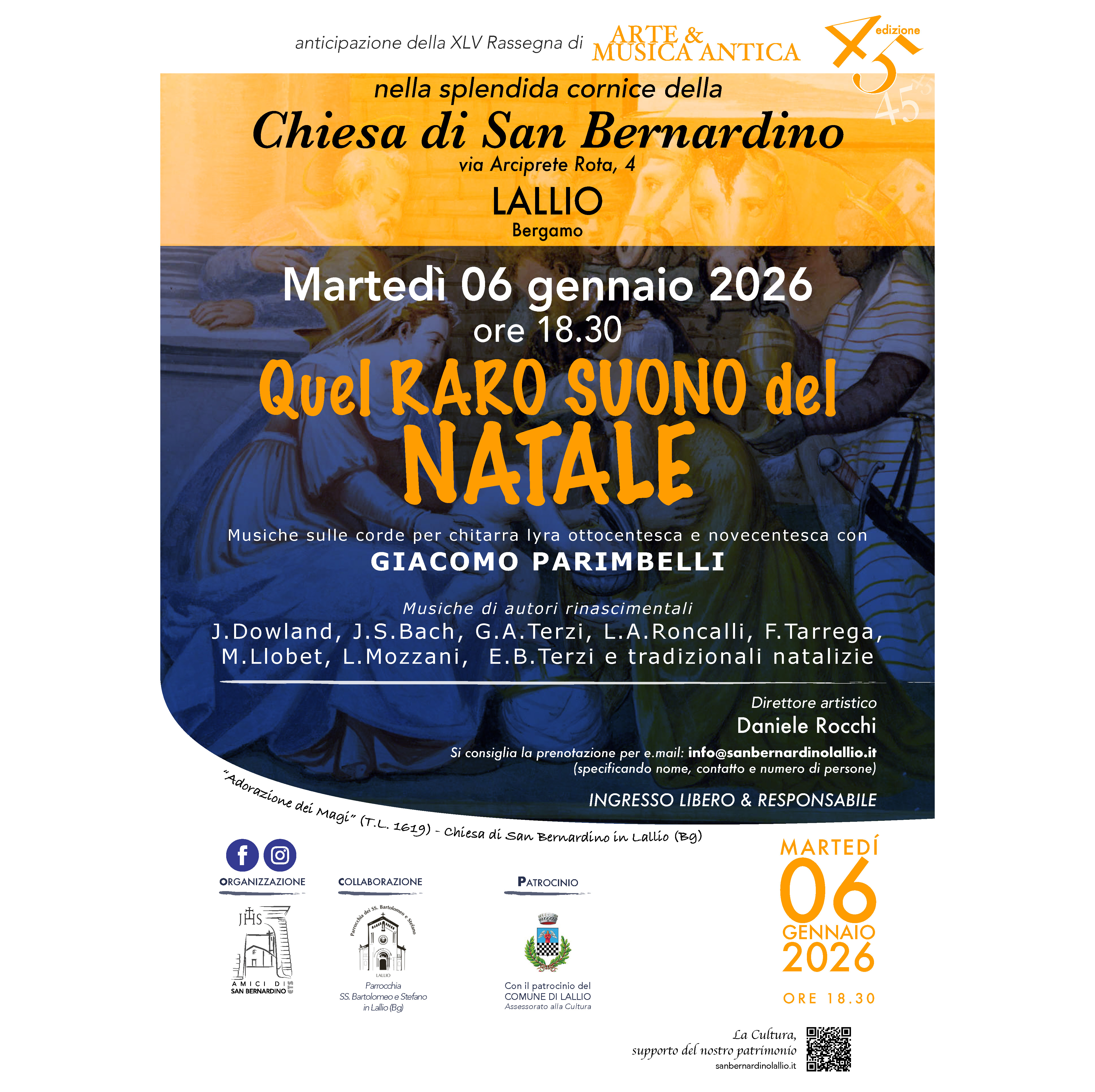 Giacomo Parimbelli suonerà con la chitarra lyra musiche rinascimentali e barocche di J.Dowland, J.S.Bach, G.A.Terzi, L.A.Roncalli, F.Tarrega, M.Llobet, L.Mozzani, E.B.Terzi e tradizionali natalizie.