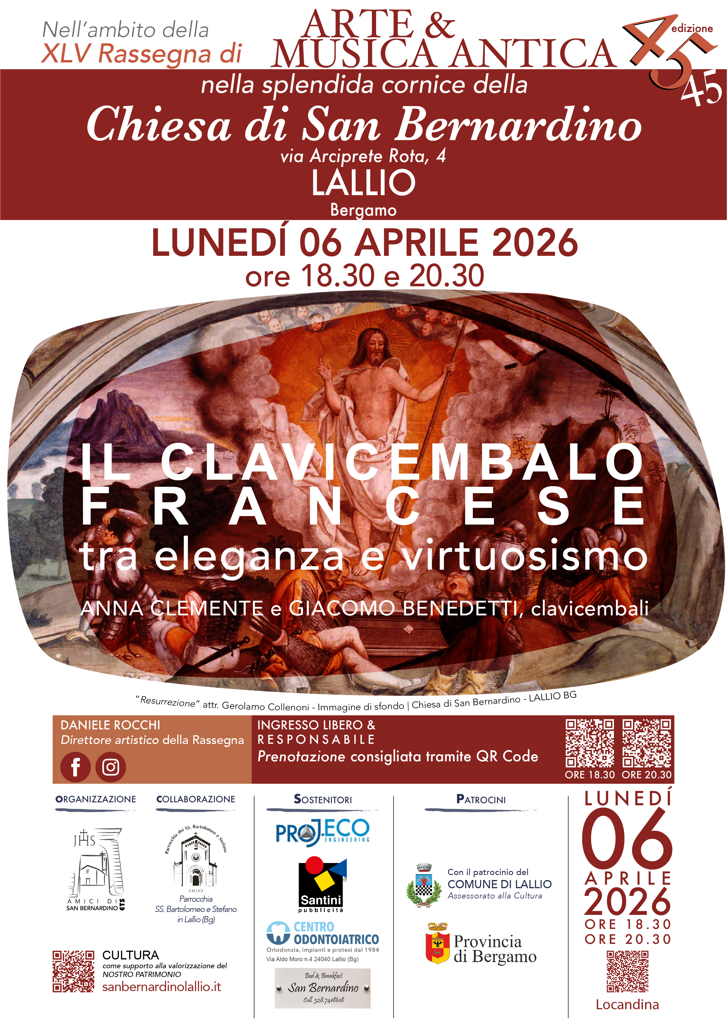 Presso la Chiesa di San Bernardino di Lallio, รจ in programma un concerto di due clavicembali suonati da Anna Clemente e Giacomo Benedetti.