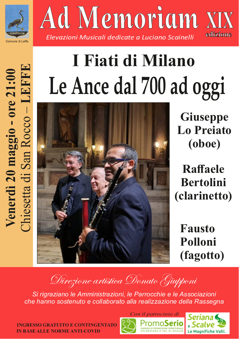 Elevazioni Musicali dedicate a Luciano Scainelli. I Fiati di Milano, Le Ance del 700 ad oggi, Giuseppe Lo Preiato (oboe) Raffaele Bertolini (clarinetto) Fausto Polloni (fagotto) Direzione artistica Donato Giupponi.