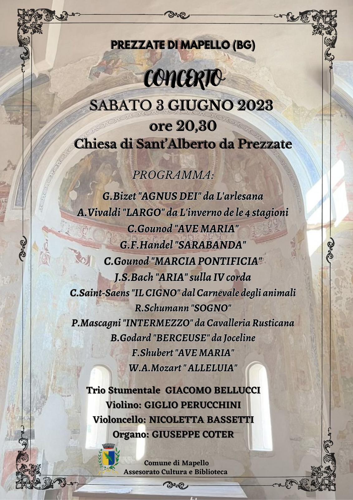 Concerto a cura del violino Giglio Perucchini, del violoncello Nicoletta Bassetti e dell'organo Giuseppe Coter, con musiche da Bizet, Vivaldi, Mozart, Bach e molti altri, in una serata musicale tutta da ascoltare.