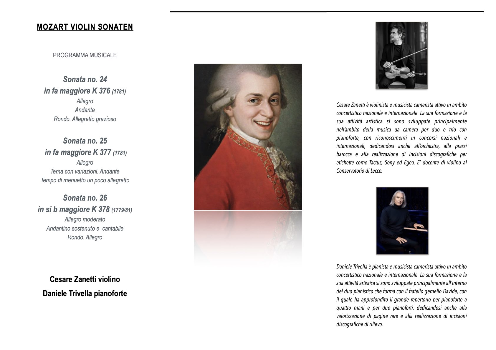 Assaggio della brillantezza e dell’equilibrio strumentale che caratterizza queste opere viennesi, dove violino e pianoforte si alternano in un dialogo serrato e paritario, le Sonate K 376 e K 377, entrambe in fa maggiore, condividono un carattere cantabile e solare, ma differiscono per struttura: la prima con un Andante in si bemolle che introduce un contrasto lirico, la seconda con un Minuetto conclusivo che evoca il mondo del salotto viennese. Chiude il programma la Sonata K 378, composta forse già nel 1779 ma pubblicata nel gruppo viennese, nota per la sua eleganza e per un finale rondo che unisce grazia e vivacità. Nel loro insieme, queste sonate rappresentano Mozart nel momento in cui, liberatosi dal cappio di Salisburgo, cerca a Vienna il riconoscimento come compositore e interprete indipendente, in una stagione di ottimismo segnata da successi editoriali e da quel “galante” equilibrio tra virtuosismo e intimità che conquisterà il pubblico dell’epoca.