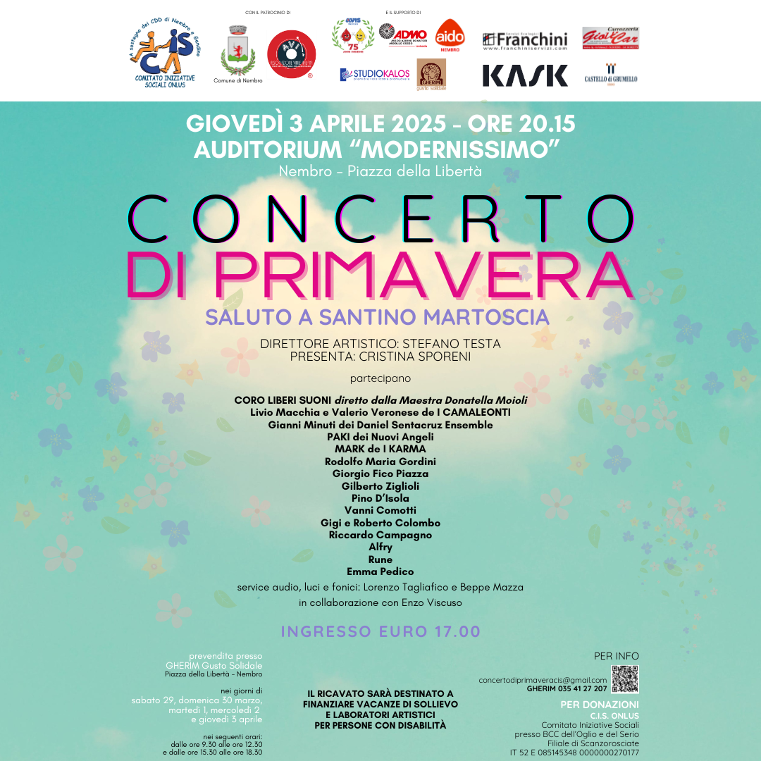 Ritorna l'atteso appuntamento con il Concerto di Primavera, un evento che promette di essere un'esperienza unica di musica e emozioni, all'insegna della bellezza e della solidarietà. Quest'anno, il concerto sarà un'occasione speciale per rendere omaggio a Santino Martoscia, artista che ha segnato profondamente il panorama musicale e culturale della nostra comunità.