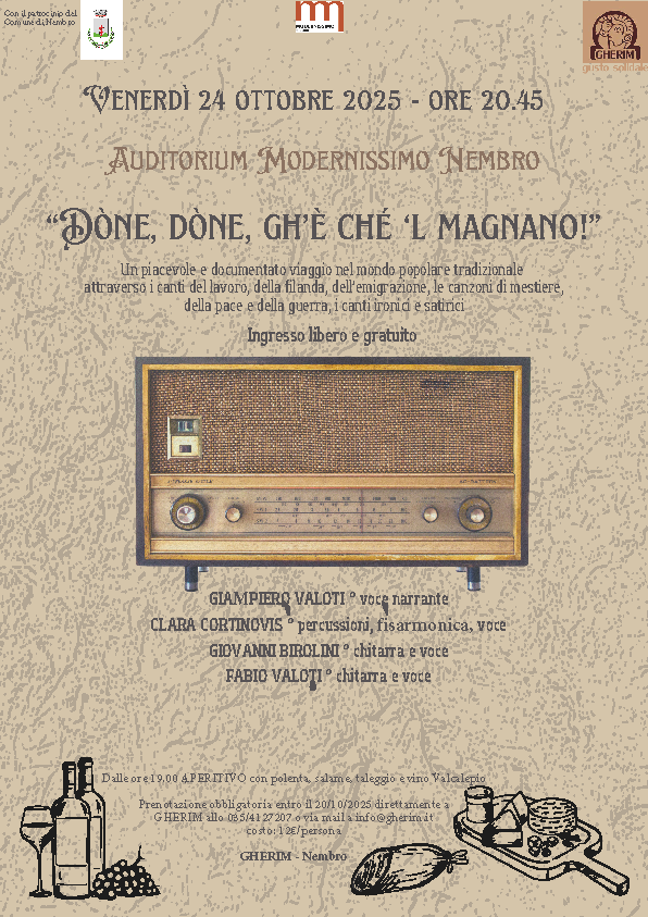 Un piacevole e documentato viaggio nel mondo popolare tradizionale attraverso i canti del lavoro, della filanda, dell’emigrazione, le canzoni di mestiere, della pace e della guerra, i canti ironici e satirici.
