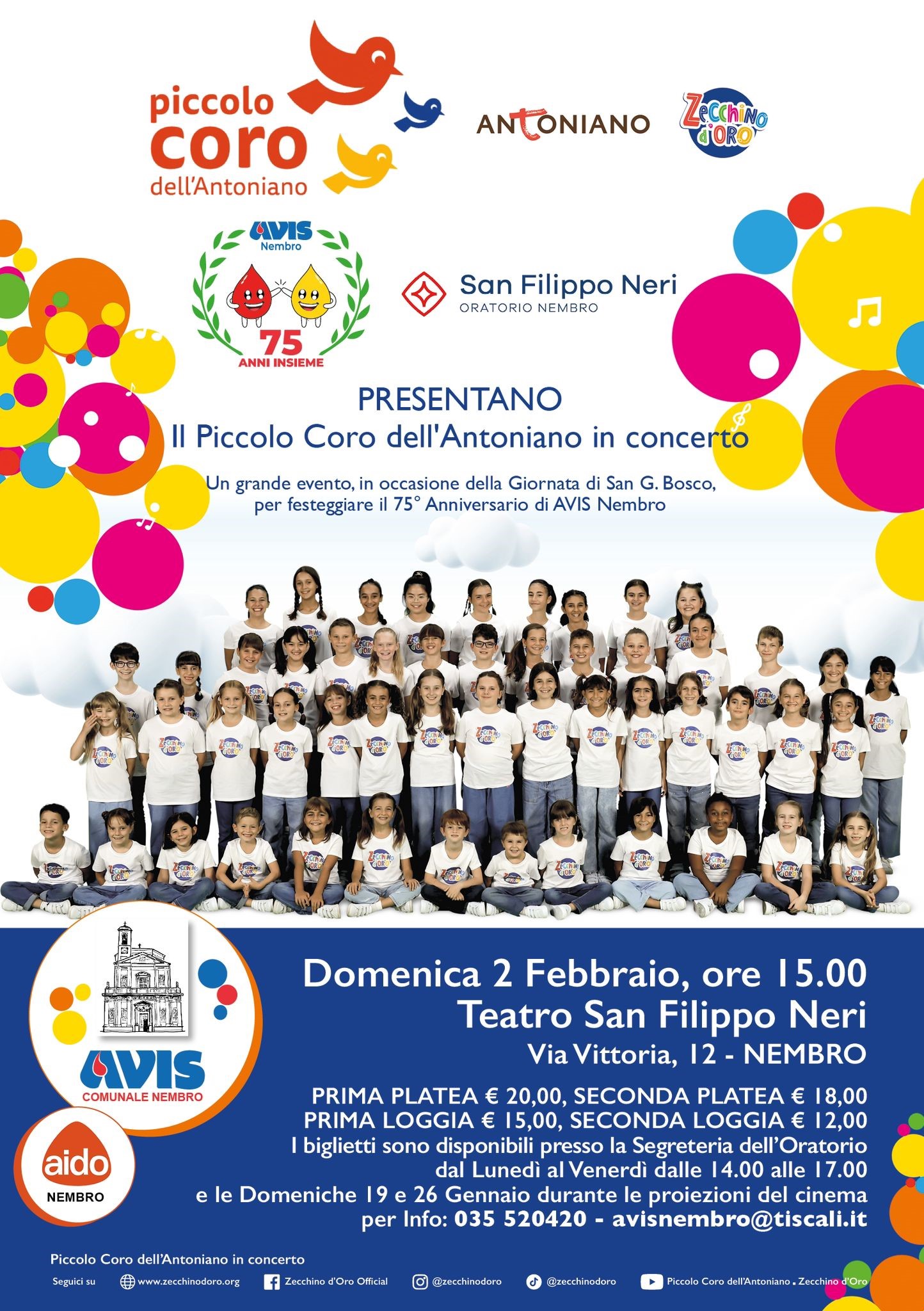 Un grande evento in occasione della Giornata di San Giovanni Bosco, per festeggiare il 75esimo Anniversario di AVIS Nembro. Il Coro dell'Antoniano si esibirร in concerto nel pomeriggio di domenica 2 febbraio.