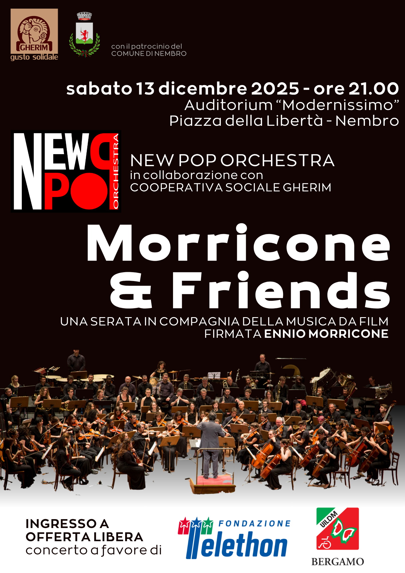 All'Auditorium Modernissimo, New Pop Orchestra, in collaborazione con la Cooperativa Gherim di Nembro, presenta «Morricone & Friends», un concerto a favore di Telethon.