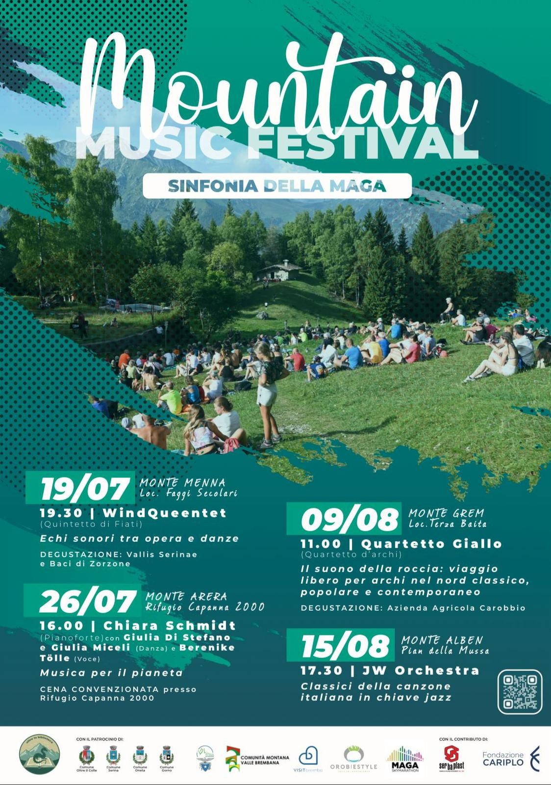 La Biblioteca Comunale di Oltre il Colle รจ lieta di annunciare la seconda edizione del Mountain Music Festival - Sinfonia della MAGA, una serie di concerti pensati per celebrare la bellezza delle nostre montagne. Questa rassegna musicale, in cui si vuole coniugare natura e cultura in un'esperienza unica e indimenticabile, รจ stata realizzata con il contributo del patrocinio oneroso di Fondazione Cariplo e della Provincia di Bergamo nellโambito del bando per concessione di contributi destinati a iniziative in ambito culturale, oltre che grazie al supporto di Serbaplast serramenti in PVC, del Comune di Gorno e del Comune di Oneta. Il festival, che si svolgerร nei mesi di luglio e agosto, comprende quattro concerti gratuiti in scenari mozzafiato delle Orobie bergamasche. Alcuni appuntamenti musicali saranno accompagnati da degustazioni di prodotti locali, anchโesse gratuite, o da cene convenzionate in rifugio, offrendo un viaggio sensoriale che abbraccia diversi generi musicali e sapori del territorio. La rassegna musicale si estende su quattro settimane, con concerti che si terranno in orari variabili, dalla tarda mattinata al tramonto. La partecipazione ai concerti richiede il cammino verso i luoghi degli eventi, rendendo il percorso parte integrante dell'esperienza. I percorsi variano in difficoltร per adattarsi alle esigenze di tutti: alcune mete sono facilmente raggiungibili con passeggiate adatte a ogni livello, mentre altre richiedono un minimo di preparazione atletica.