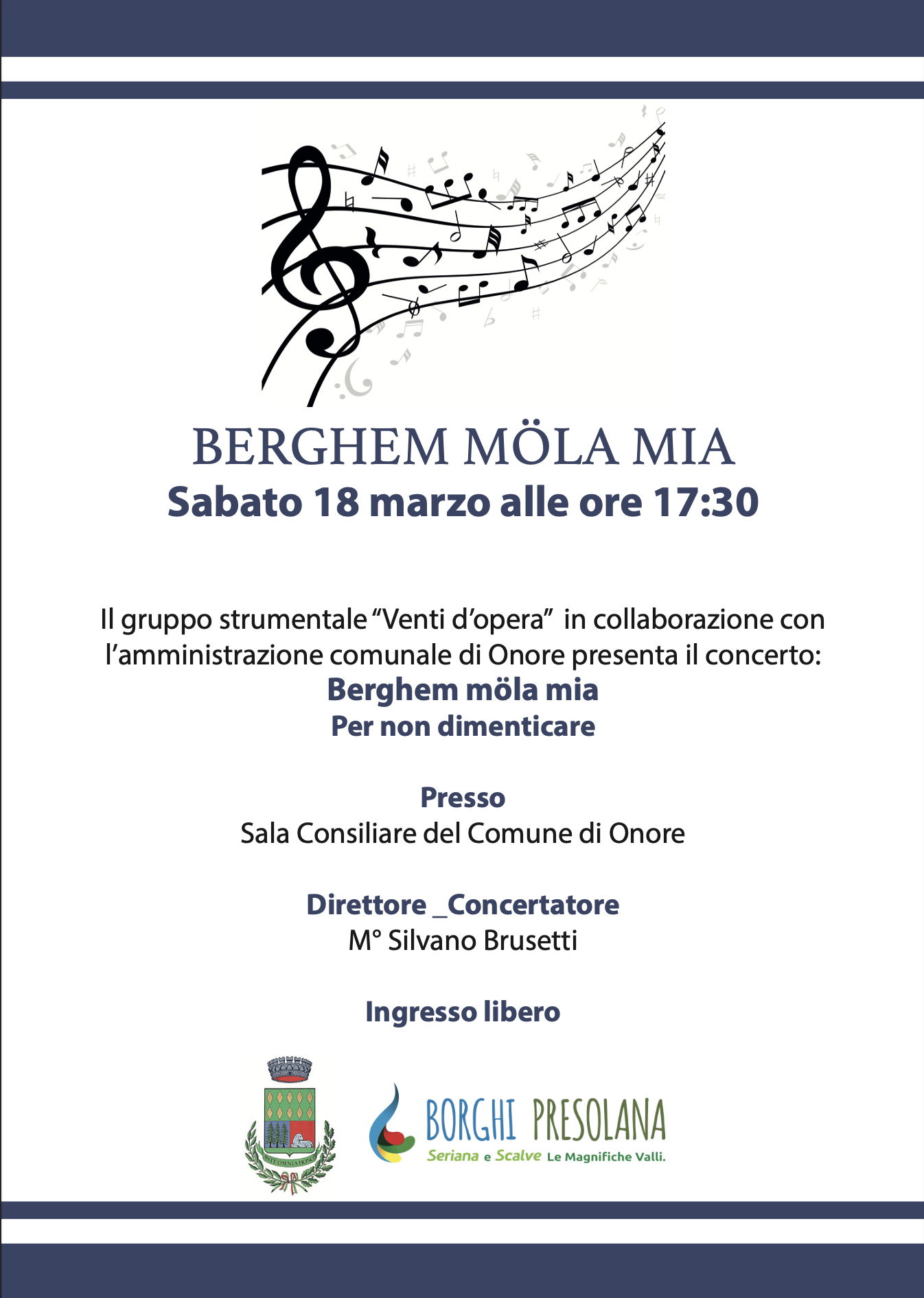 Nella sala consiliare del Comune di Onore, il gruppo musicale "Venti d'opera" in collaborazione con l'amministrazione comunale di Onore presenta il concerto: "Berghem möla mia" per non dimenticare.