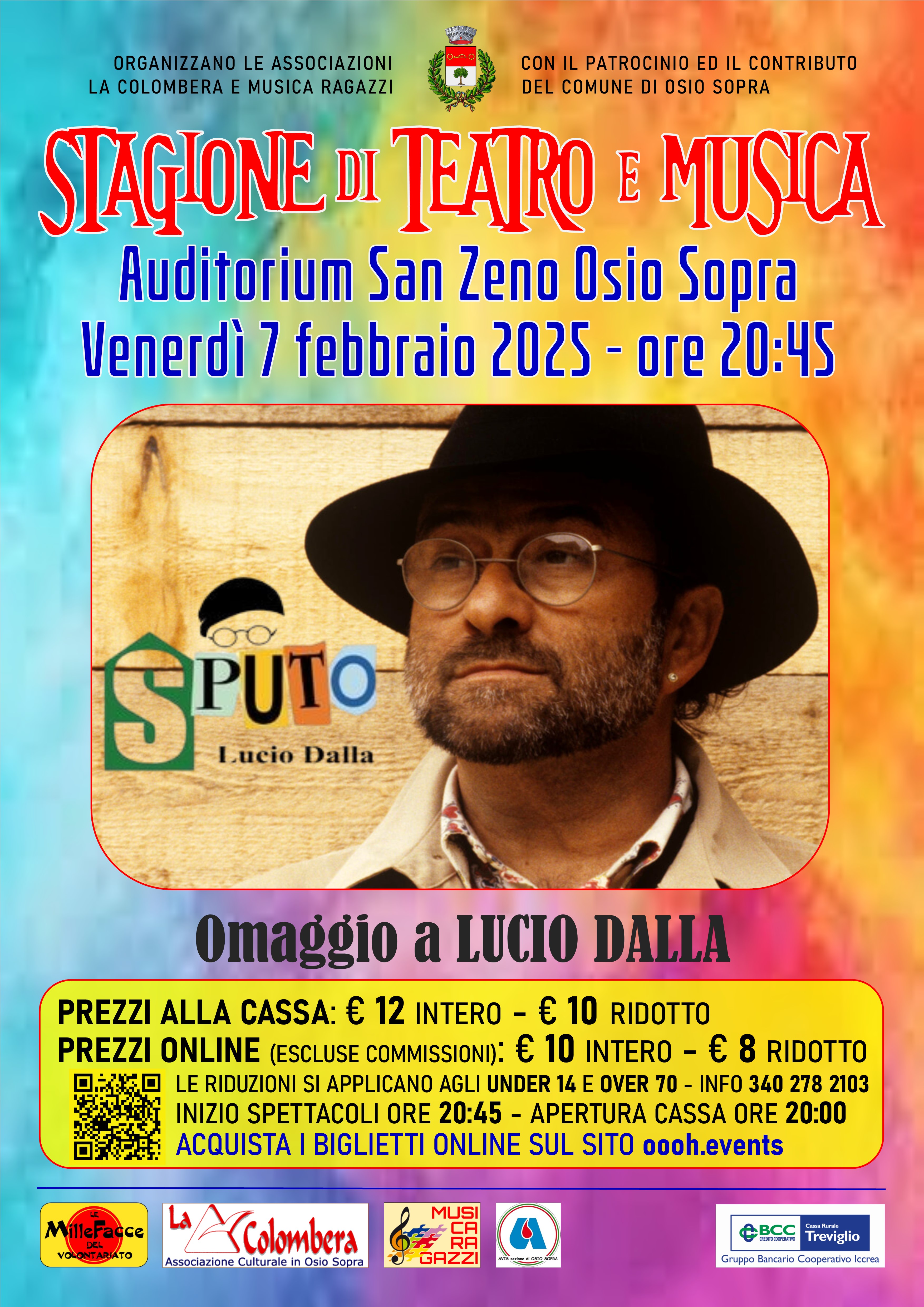 Venerdì sera l’Auditorium San Zeno di Osio Sopra accoglierà Sputo, band tributo a Lucio Dalla che si sta affermando nei teatri e nei club del nord Italia per il suo approccio rispettoso e originale alle canzoni del grande cantautore bolognese.