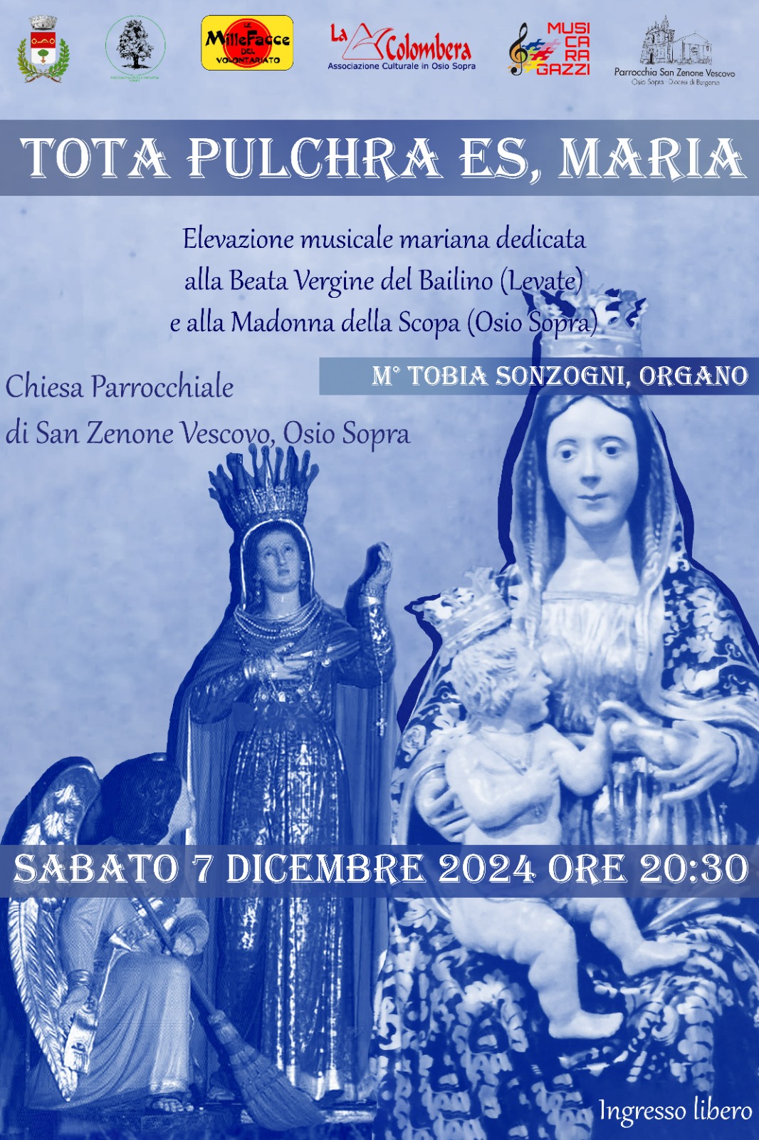 L’Associazione Culturale "Musica Ragazzi" di Osio Sopra, in collaborazione con l’Associazione Civica e Culturale "L’Olmo" di Levate, la Parrocchia San Zenone Vescovo di Osio Sopra col patrocinio del Comune di Osio Sopra, invita al concerto dal titolo “Tota pulchra es, Maria", elevazione musicale mariana dedicata alla Beata Vergine del Bailino (a Levate) e alla Madonna della Scopa (Osio Sopra).