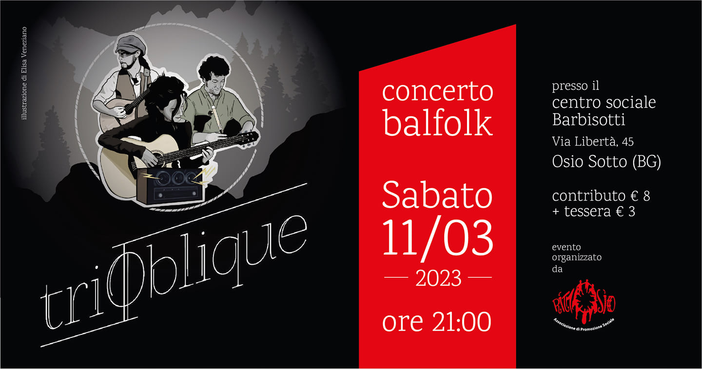 Il Trioblique รจ un meraviglioso incrocio dei bagagli musicali di Susanna Roncallo, Aurรฉlien Congrega e Dario Gisotti. Con chitarra, bouzouki, flauti, cornamusa e voci ci faranno ballare e saltare con la loro grinta inconfondibile.