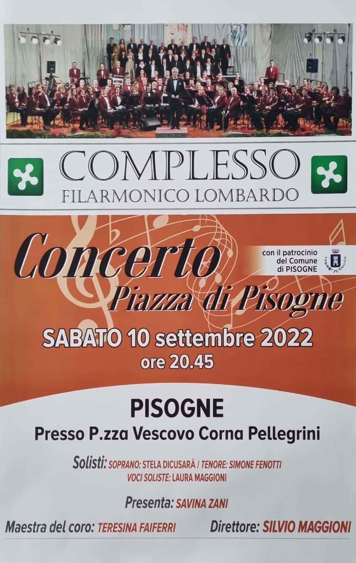 Sabato 10 settembre alle ore 20:45 in Piazza Vescovo Corna Pellegrini a Pisogne si svolgerà il concerto del Complesso Filarmonico Lombardo, diretto da Silvio Maggioni, con la maestra del coro Teresina Faiferri.