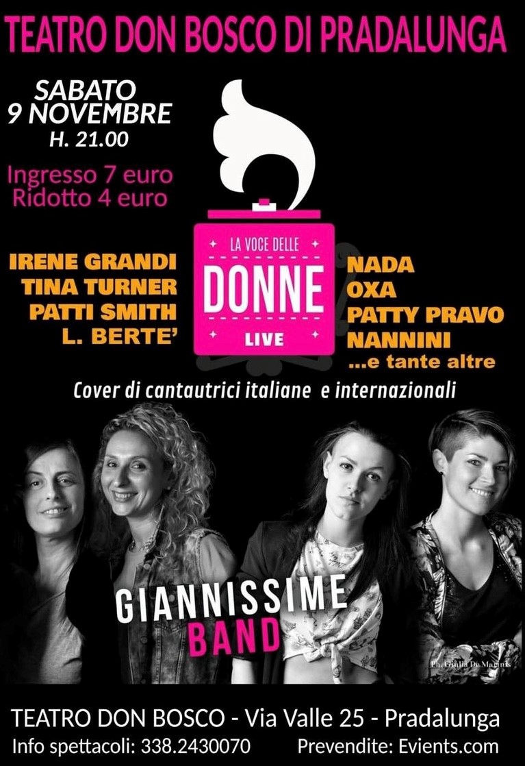 Il 9 novembre, alle ore 21:00, il Teatro Don Bosco di Pradalunga ospiterà un evento straordinario dedicato alle più grandi voci femminili italiane e internazionali degli anni '70, '80 e '90. Le talentuose Giannissime Band vi porteranno in un emozionante viaggio musicale, reinterpretando con passione i brani che hanno segnato la storia della musica.