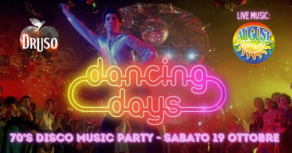 Torna a Bergamo il disco party anni 70 più infuocato di sempre e sarà anche il 16esimo compleanno del Druso! Un motivo in più per ballare fino al mattino! Siamo in pieno decennio anni ’70.. LA Febbre Del Sabato Sera è già un cult e in Italia arriva pochi anni dopo la telenovela brasiliana ambientata nella discoteca “Dancin Days” dove impazza la Disco Music! Ricordate lo Studio 54? La discoteca di N.Y. allestita come un teatro? Provate ad immaginare come sarebbe stato...Ecco allora che si alza il sipario e scopriamo che immagini, costumi, musica ed eccessi sono i protagonisti della festa più divertente di sempre. E poi come dimenticare Tony Manero? Il film e la musica della Febbre Del Sabato Sera hanno sigillato per sempre lo stile glam e disco degli anni ’70... Arriva a Bergamo Dancing Days il party anni ’70 che racchiude tutta la migliore musica disco dell’epoca dagli Chic ai Bee Gees, da Blondie a Carl Douglas, ovviamente Donna Summer e molti altri ancora...Funky-Soul-Black-R&B-Disco-Philadelphia Sound