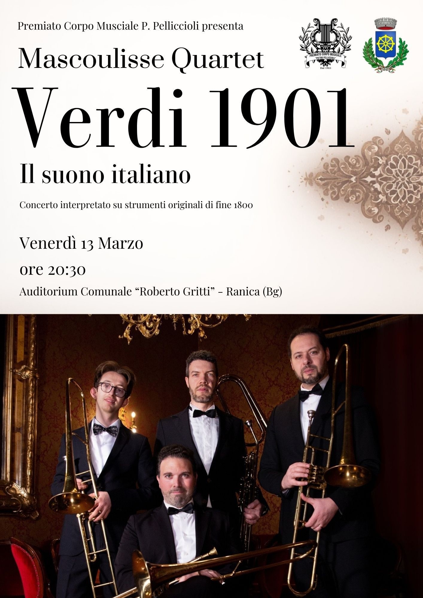 l Premiato Corpo Musicale P. Pelliccioli è lieto di presentare un appuntamento di grande fascino dedicato alla tradizione musicale italiana: «Verdi 1901 – Il suono italiano», concerto del Mascoulisse Quartet eseguito su strumenti originali di fine Ottocento.