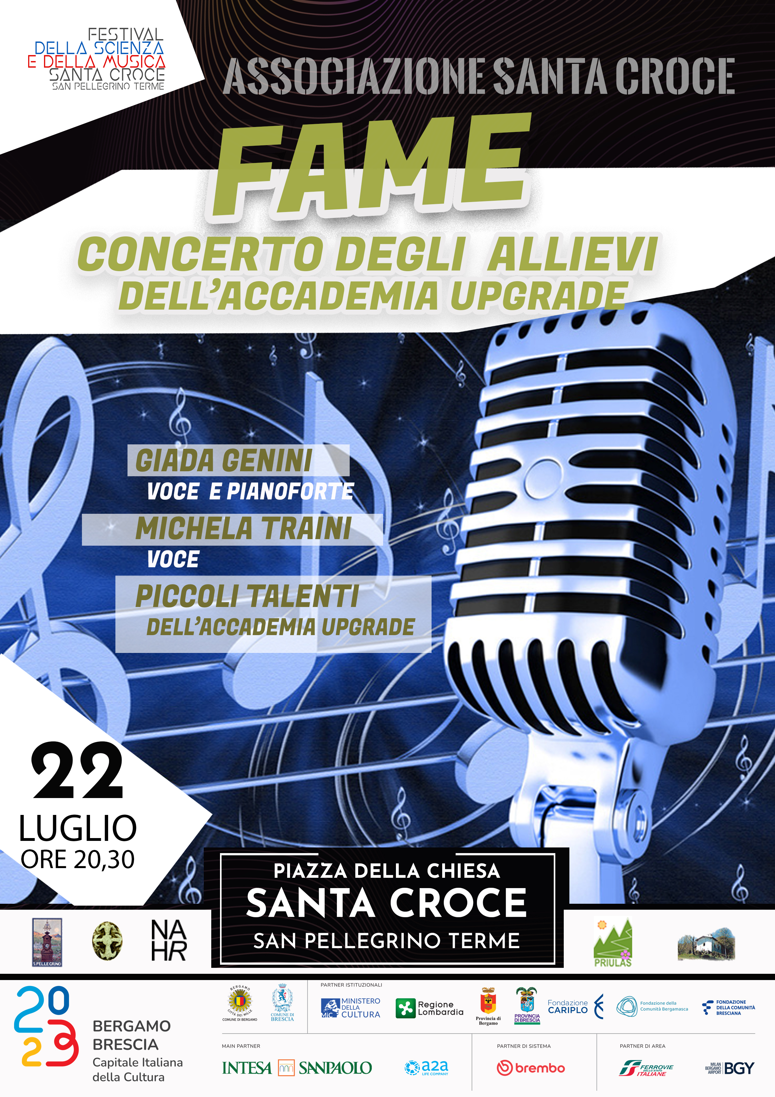 Concerto degli allievi dell'Accademia Upgrade di San Pellegrino Terme; si esibiranno Giada Genini voce e pianoforte e Michela Traini voce, insieme ai piccoli talenti dell'accademia, per una serata tutta da ascoltare.