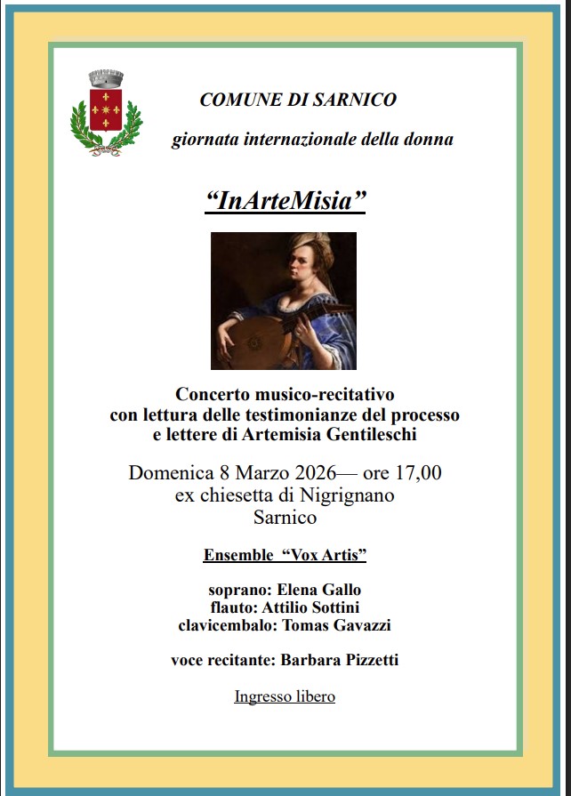 In occasione della Giornata Internazionale della Donna, domenica 8 marzo, alle 17:00, all'ex chiesetta di Nigrignano a Sarnico, si terrà «In ArteMisia», un concerto musico-recitativo dedicato alla figura straordinaria di Artemisia Gentileschi, una delle più grandi pittrici del Barocco italiano, nota per il suo talento straordinario e per i dipinti che ritraggono donne forti e determinate.