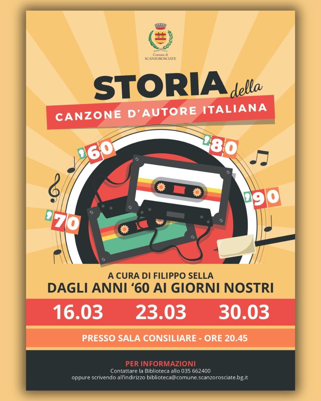 Presso la Sala Consiliare del Comune di Scanzorosciate si terrà un ciclo di incontri dedicato alla storia della canzone d’autore italiana, dalle origini negli anni Sessanta fino ai giorni nostri.