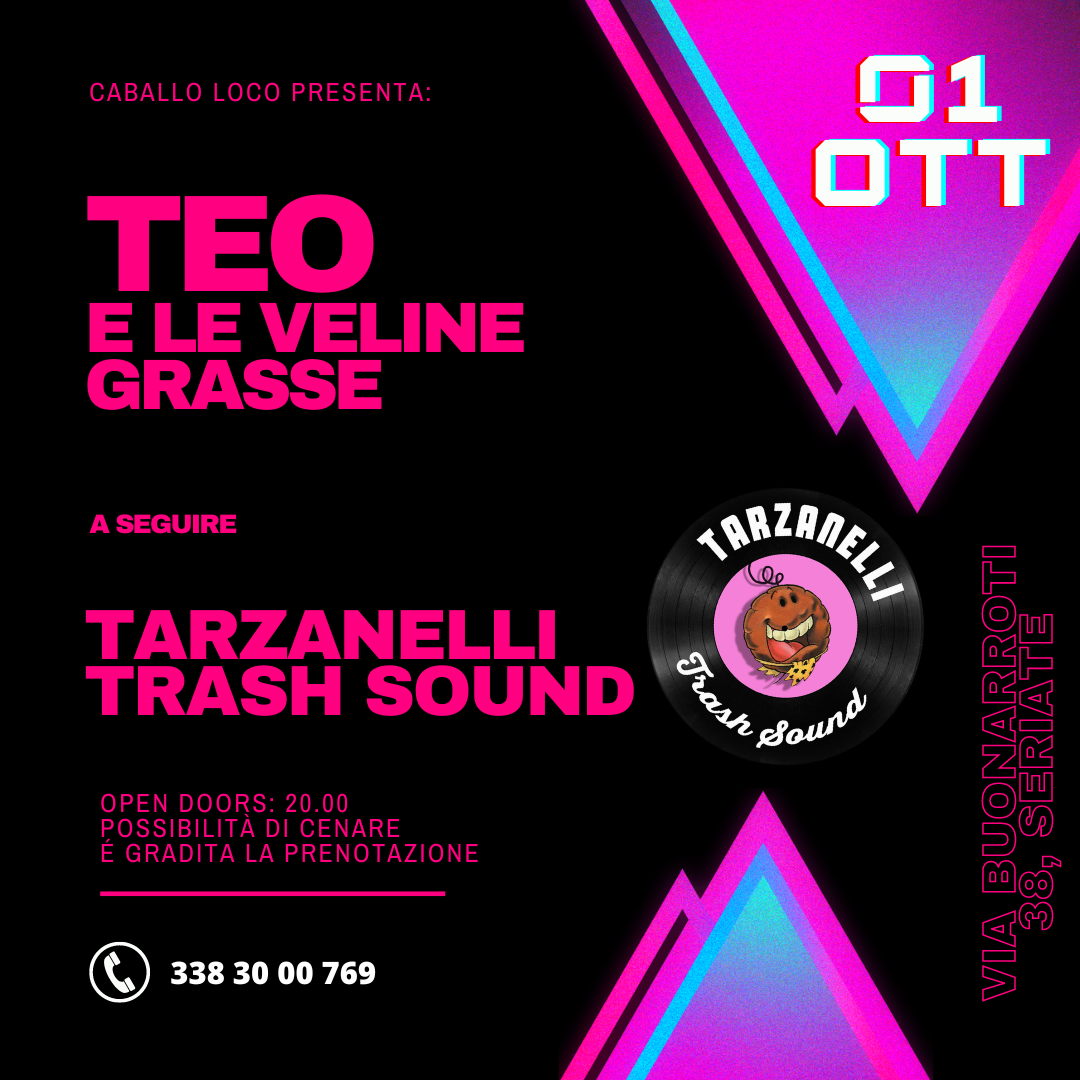Sabato 1 ottobre al Caballo Loco una scatenata Trash Night Kombo, una serata davvero speciale che inizia alle 22 con il concerto di Teo e Le Veline Grasse e più tardi prosegue con uno scatenato dj set dei Tarzanelli. Chi lo desidera può farlo già a partire dalla cena, visto che alle 20 apre la pizzeria di questo spazio.