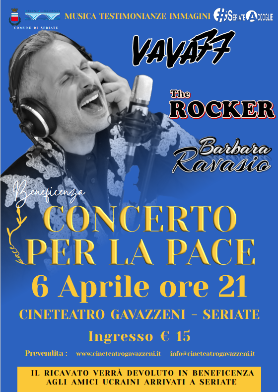 L’Amministrazione comunale e la Caritas organizzano mercoledì 6 aprile al Cineteatro Gavazzeni la serata benefica «Concerto per la pace: musica testimonianze immagini» con il Vava77 e i The rocker.