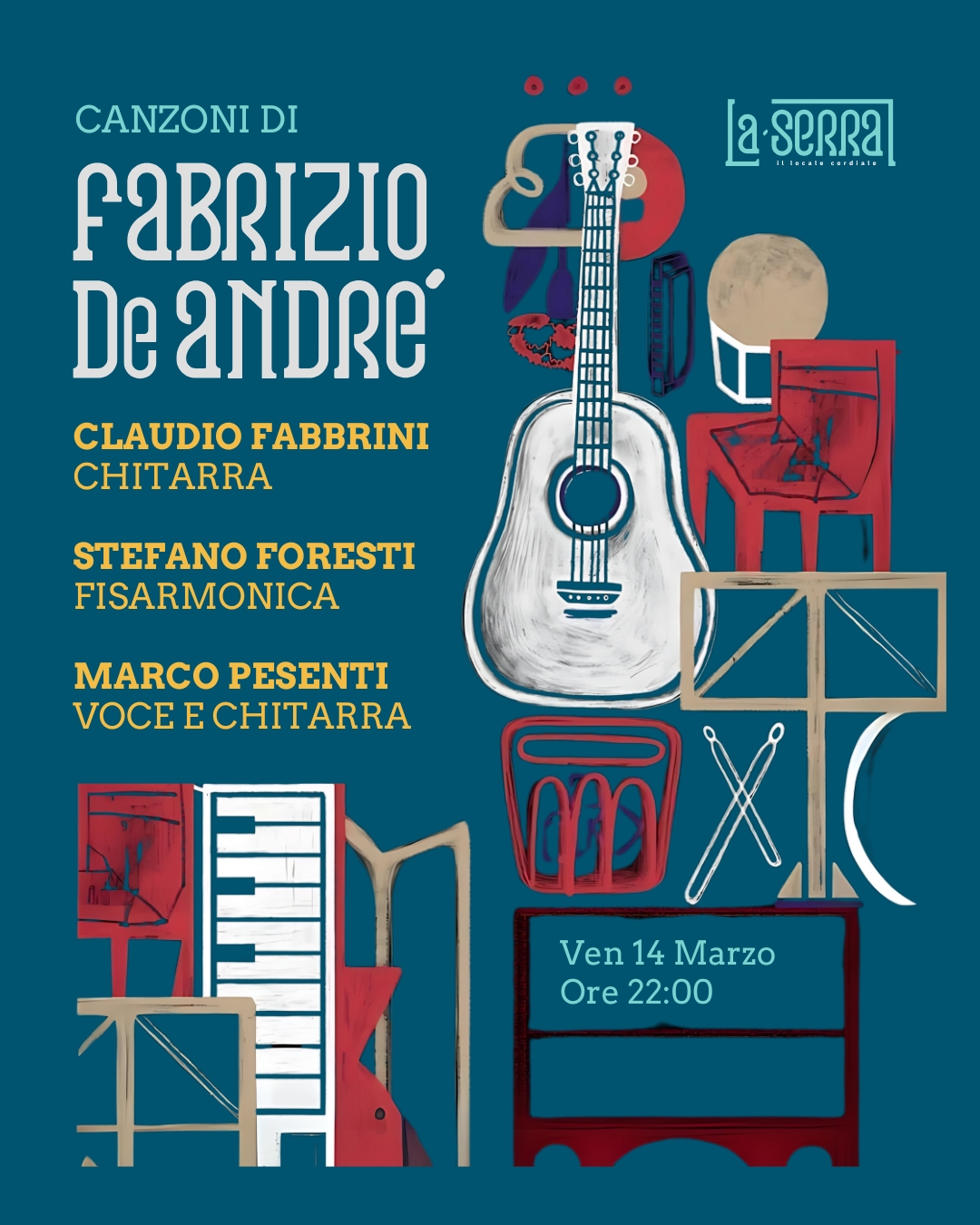 Appuntamento con la musica alla Serra! Una serata con tre musicisti che proporranno il repertorio di De Andrè, per un appuntamento a ritmo di musica che ripercorre i brani più importanti del cantautore.