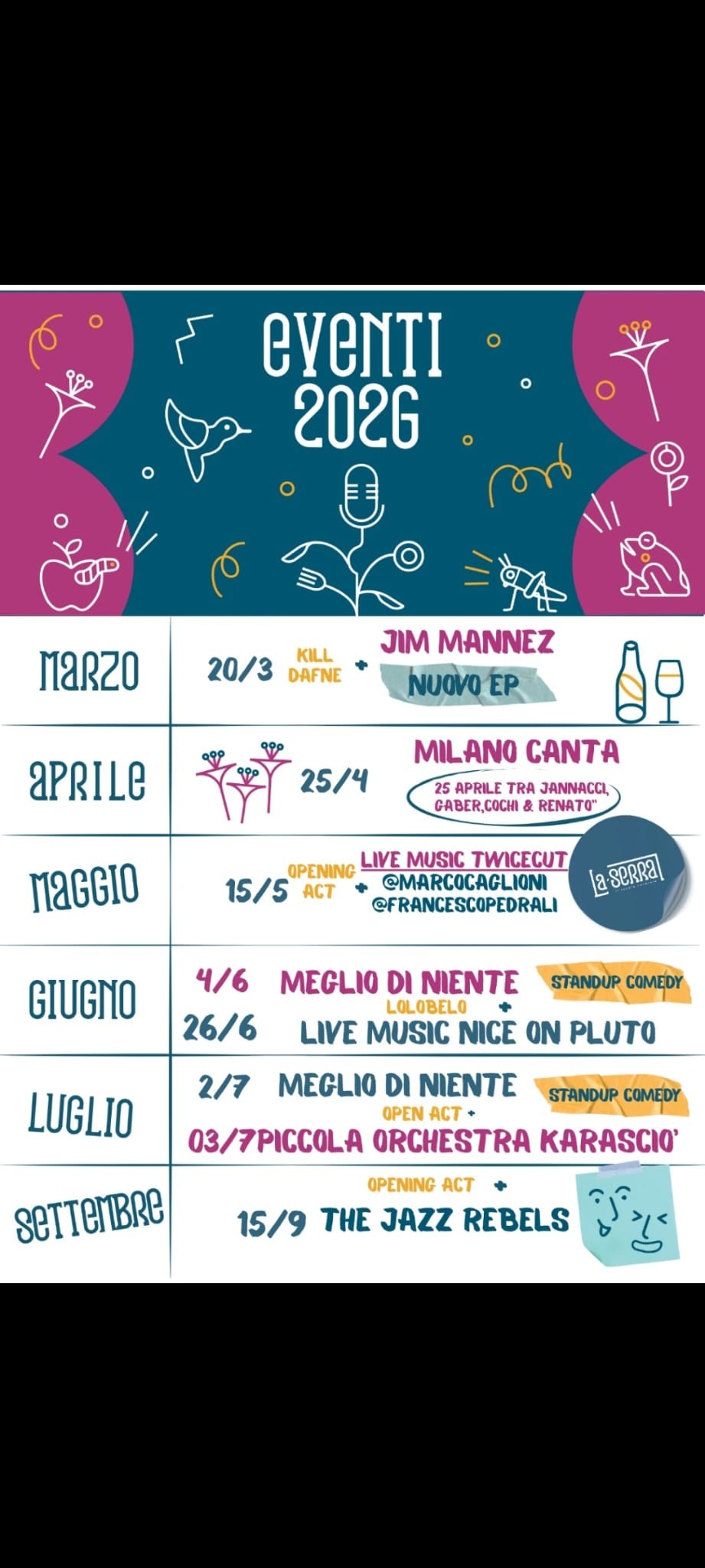 A La Serra di Seriate, tornano le serate di musica dal vivo. Sul palco un concerto tributo alle canzoni piรน iconiche di Jannacci, Gaber, Cochi e Renato.