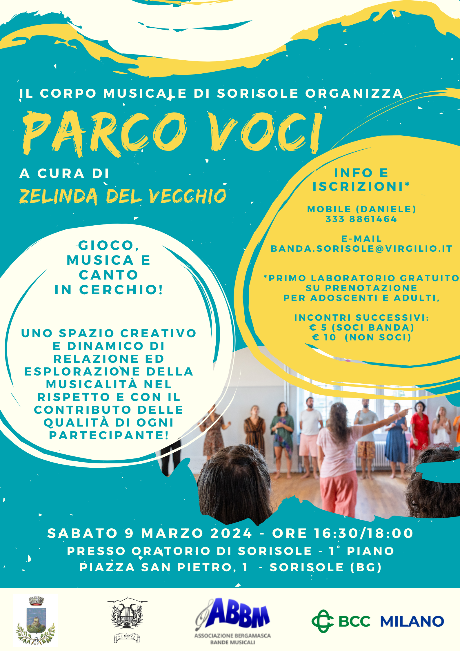 Parco Voci è un laboratorio rivolto ad adolescenti e adulti a cura di Zelinda del Vecchio. Si tratta di uno spazio creativo e dinamico di relazione ed esplorazione della musicalità nel rispetto e con il contributo delle qualità di ogni partecipante, tra circlesinging, body music e movimento.