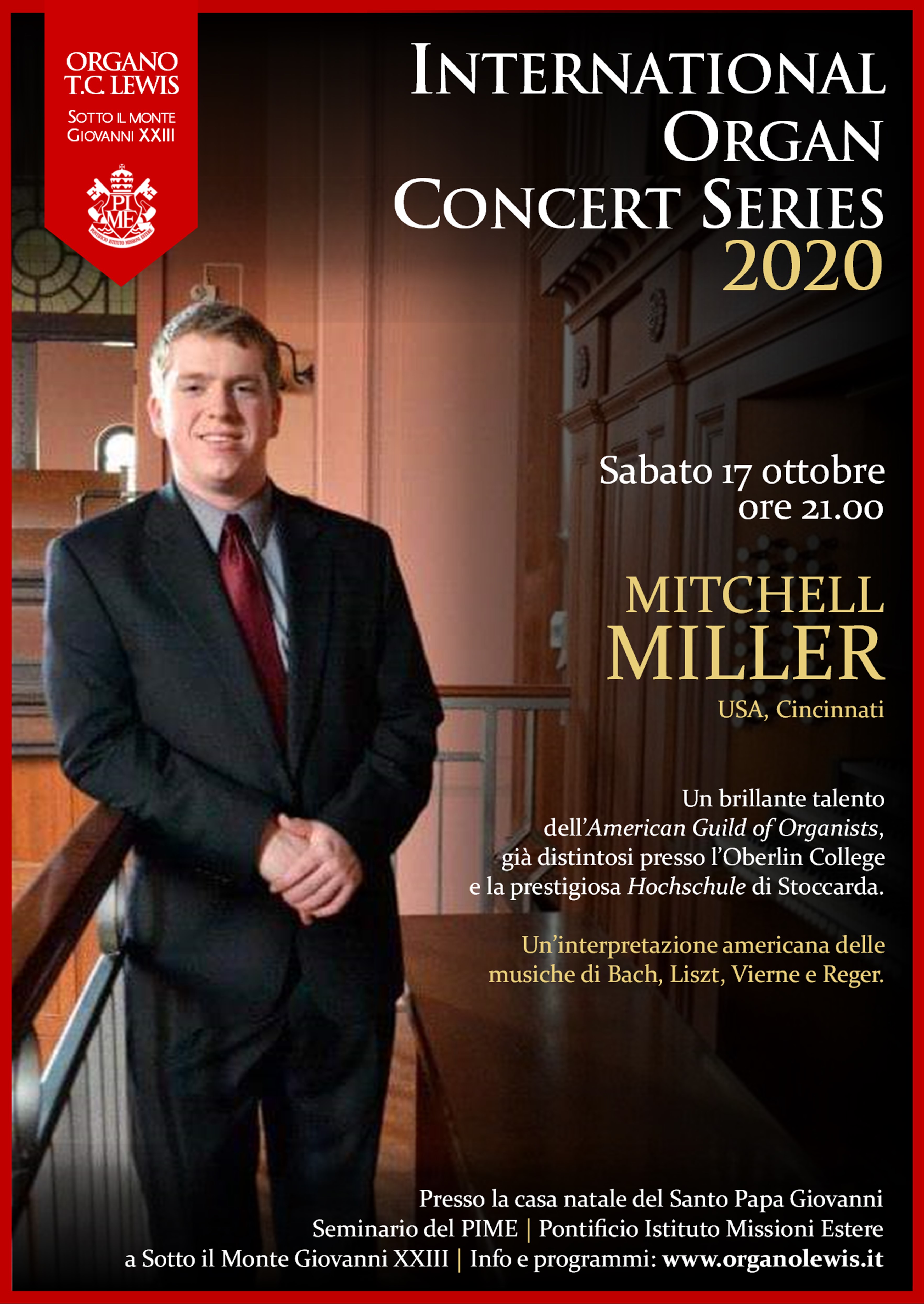 Originario di Cincinnati e già distintosi all'Oberlin College in Ohio, Mitchell Miller si sta specializzando presso la prestigiosa Hochschule für Musik di Stoccarda. Vincitore del Concorso per organo Pierre du Manchicourt nel 2018 a St. Omer (Francia), in precedenza ha ottenuto importanti riconoscimenti quali il primo premio al Tuesday Musical Scholarship Competition 2017 e il Cleveland Chapter Quimby Competition for Young Organists 2017; è stato inoltre uno dei soli cinque laureati in organo degli Stati Uniti ad essere selezionato per il round finale del 2015 Taylor Organ Competition.