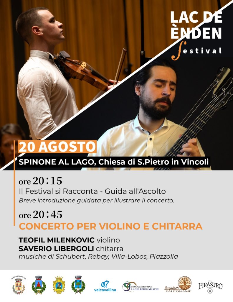 Alle 20.45 si aprirร il cuore dellโevento: un concerto per violino e chitarra che vedrร protagonisti il violinista Teofil Milenkovic e il chitarrista Saverio Libergoli. Due artisti straordinari, pronti a dare voce a un programma raffinato e coinvolgente con musiche di Schubert, Rebay, Villa-Lobos e Piazzolla.