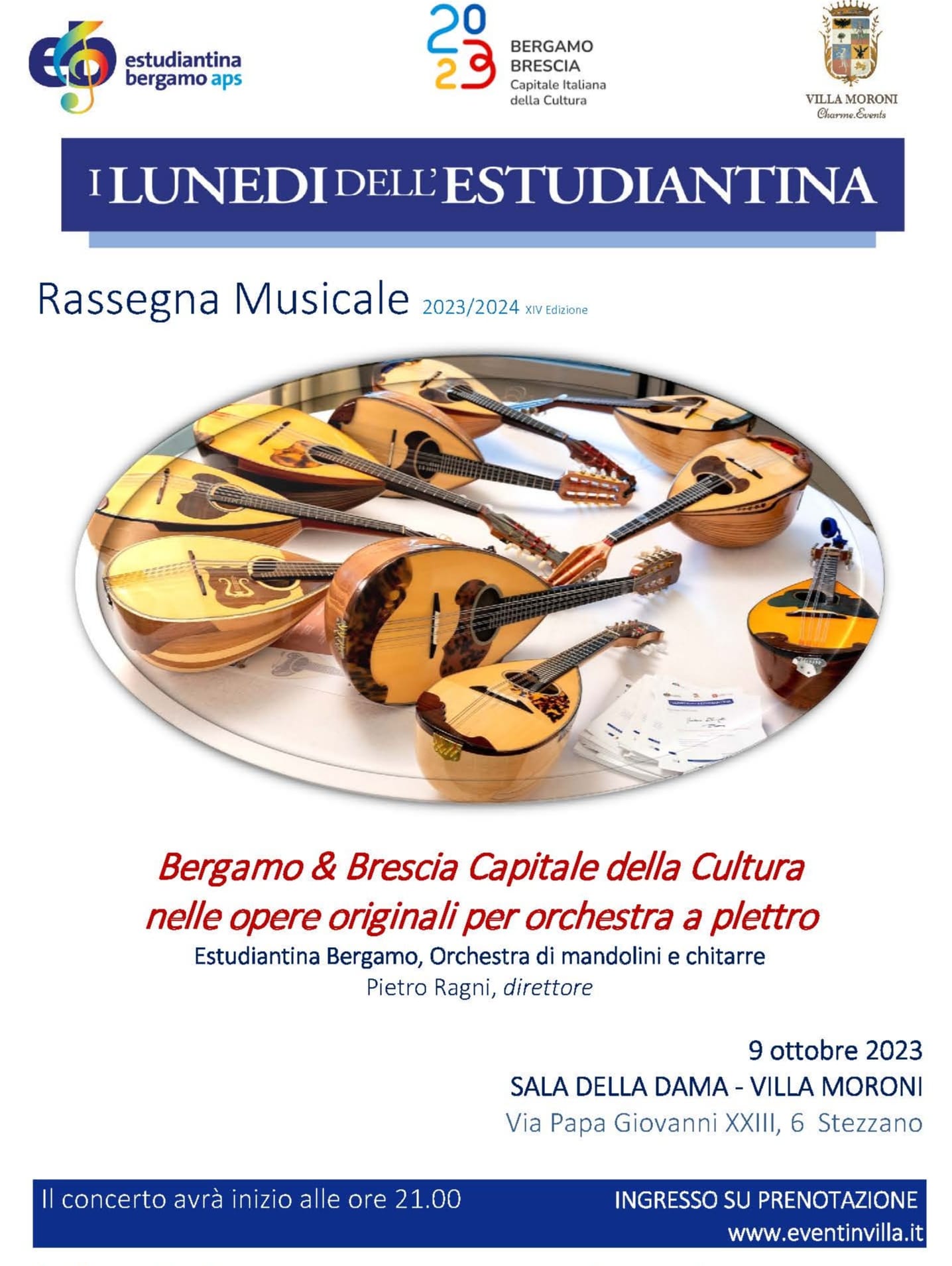 Il concerto è un omaggio a Bergamo e Brescia Capitale Italiana della Cultura 2023. Si eseguiranno brani originali per orchestra di mandolini e chitarre scritti da compositori delle due città.