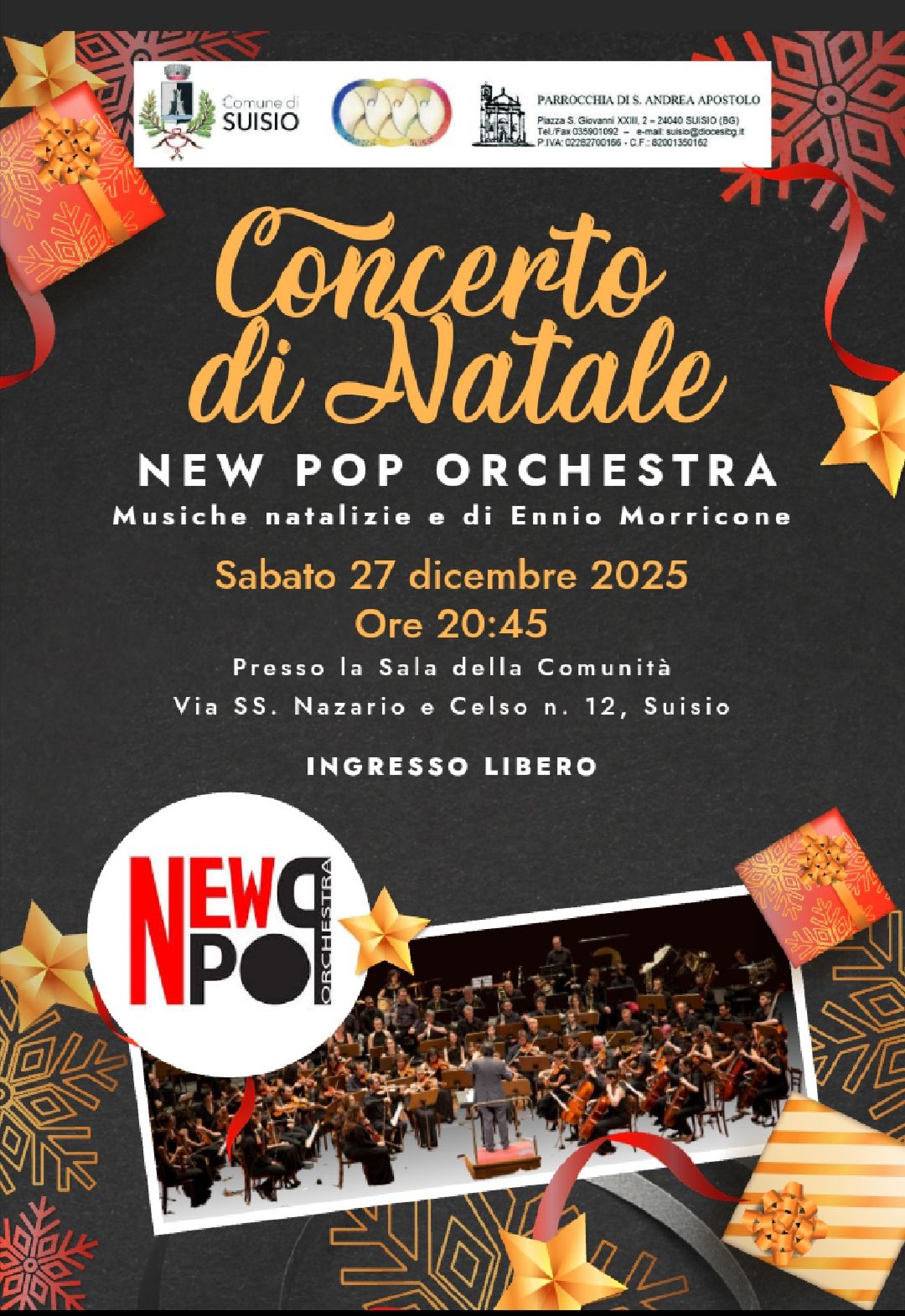 Il Comune di Suisio è lieto di invitare la cittadinanza al tradizionale Concerto di Natale che si terrà sabato 27 dicembre alle 20:45 presso la Sala della Comunità in Via SS. Nazario e Celso, 12.
