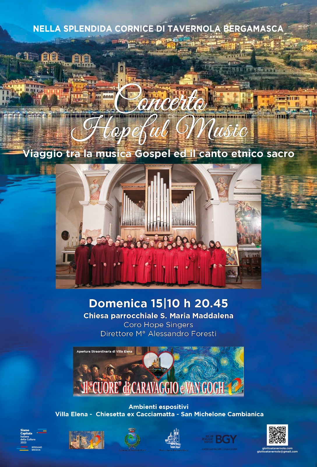Domenica 15 ottobre alle ore 20.45, si terrà presso la Chiesa parrocchiale di S. Maria Maddalena di Tavernola Bergamasca il concerto "Hopeful Music", un viaggio tra la musica Gospel e il canto etnico sacro, a cura del Coro Hope Singers, diretto dal Maestro Alessandro Foresti.